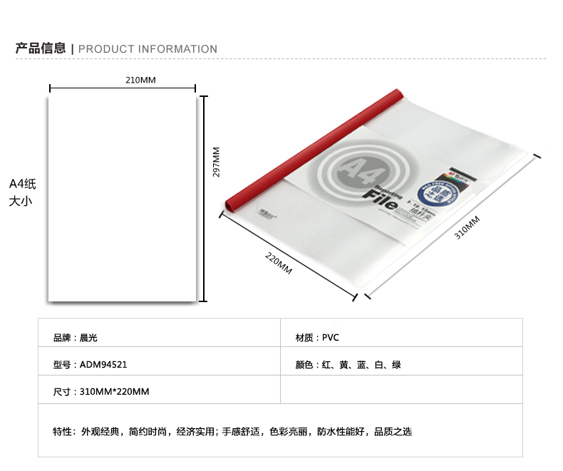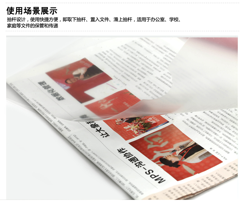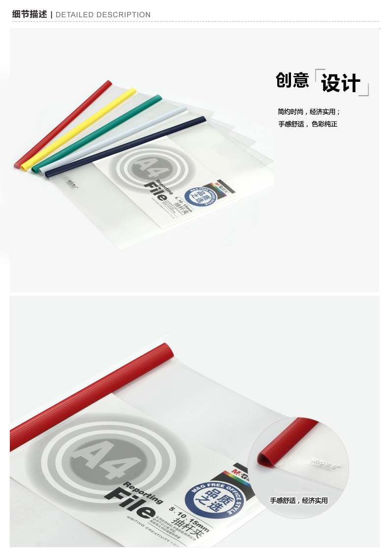 • 商品名称:晨光(M&G) ADM94521 A4抽杆夹 加厚透明抽杆 15mm A4纸50张 10个/包