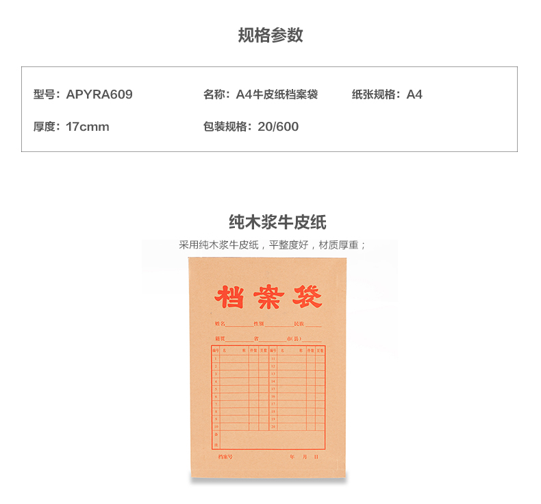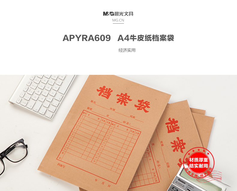 • 商品名称:晨光(M&G) APYRA60900-1 加厚款A4牛皮纸档案袋 文件袋 厚度0.17mm 20个/包