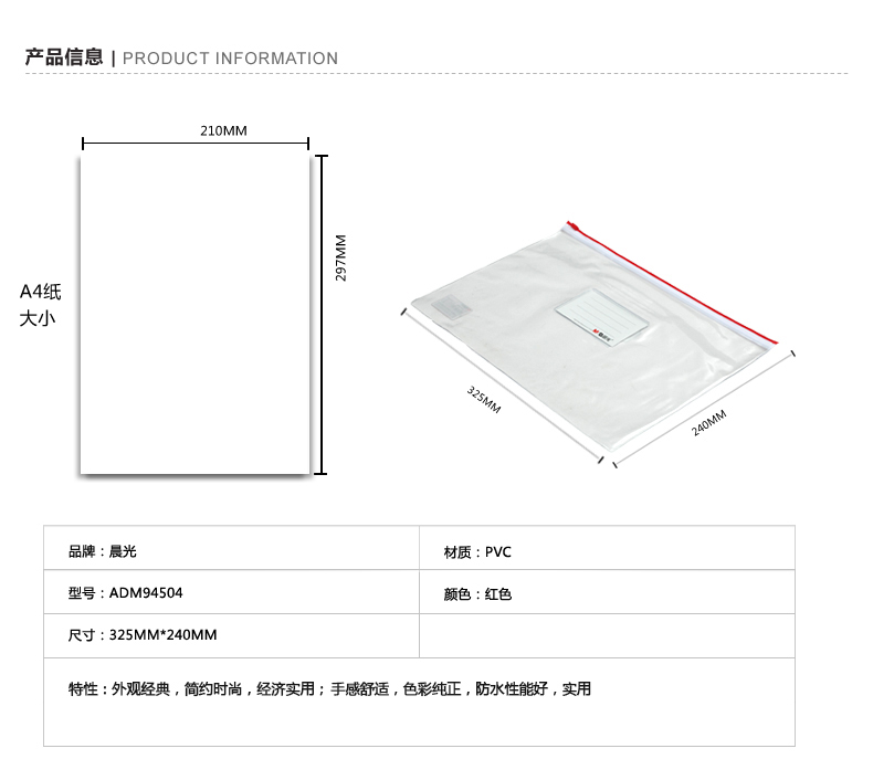 • 商品名称:晨光(M&G) ADM94504 A4透明PVC拉边袋拉链袋收纳袋