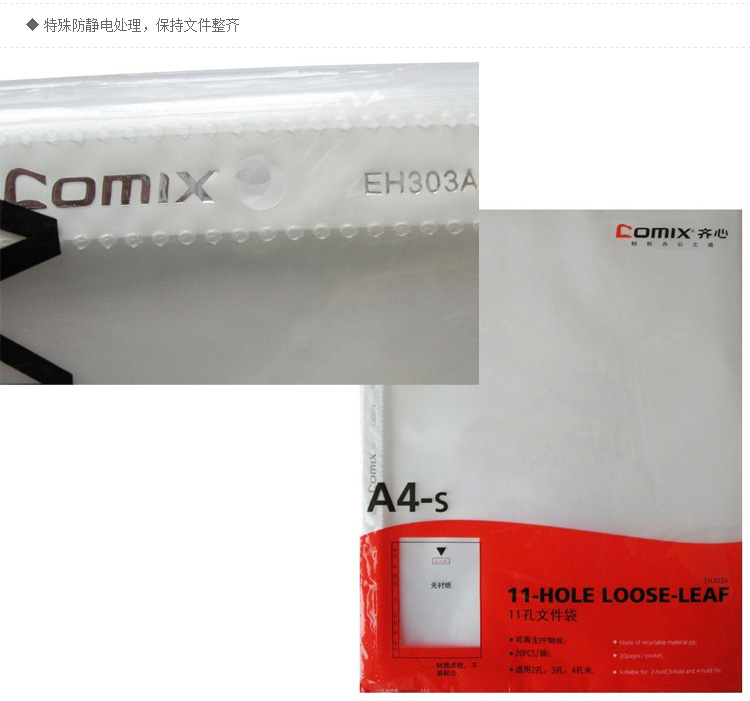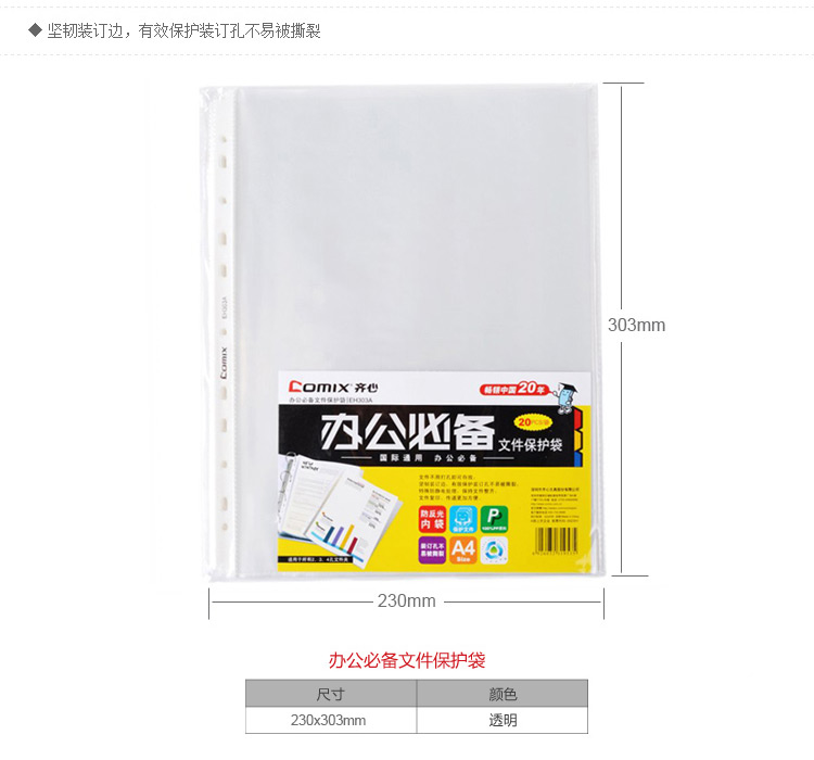 • 商品名称:齐心(Comix)EH303A 11孔A4防反光文件保护袋/替芯袋 20个/包 白色