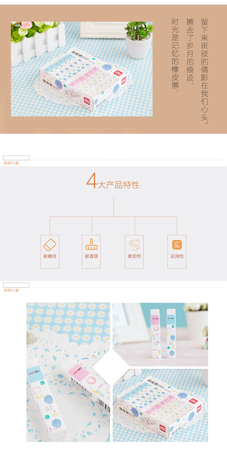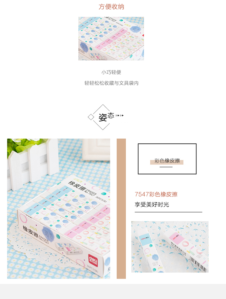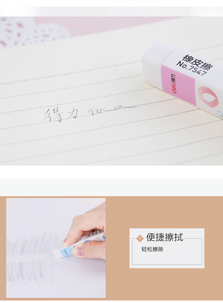 • 商品名称:得力(deli)7547 学生细长条白色橡皮擦 76*13*11mm/块 36块/盒