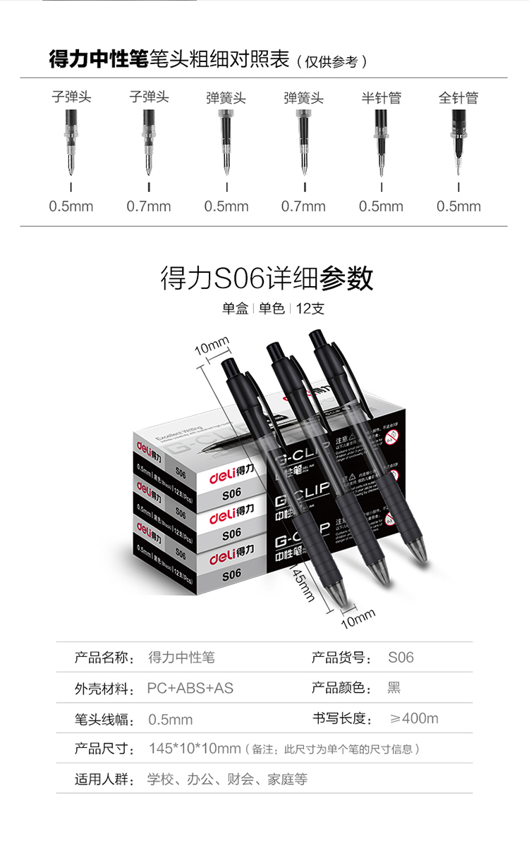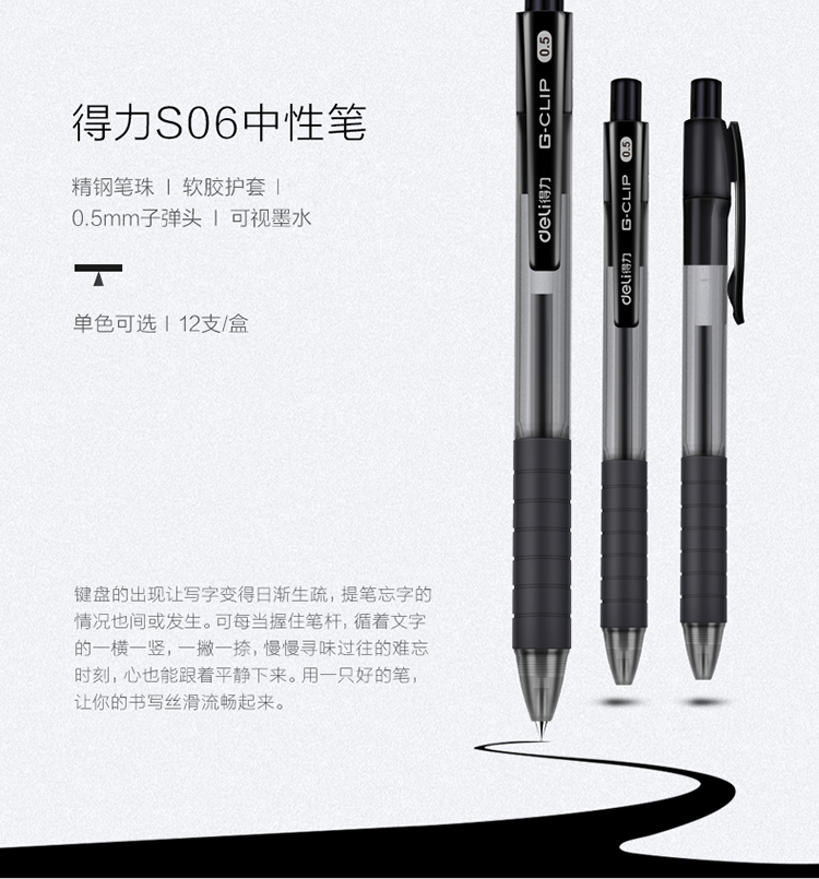 • 商品名称:得力(deli)S06 黑色按动中性笔水笔签字笔0.5mm 12支/盒