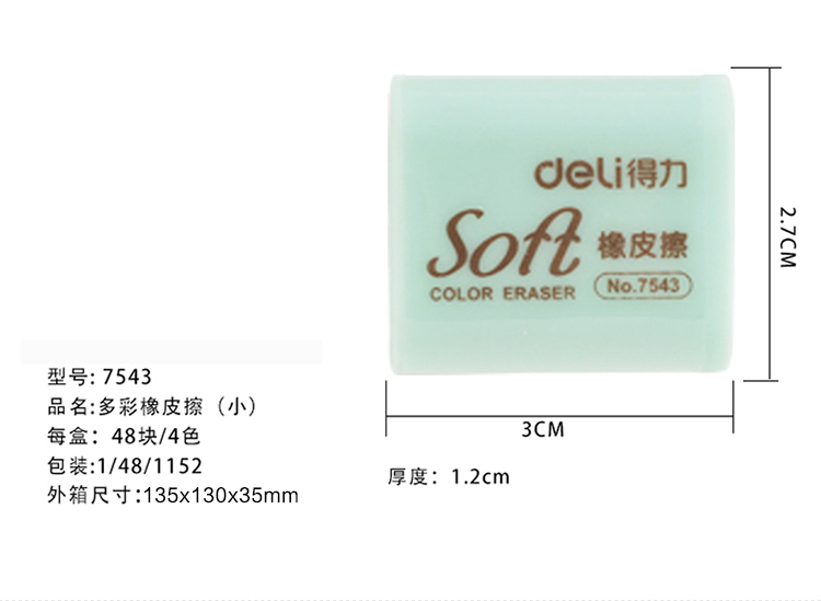 • 商品名称:得力(deli)7543 学生考试美术多彩橡皮擦 30*27*12mm/块