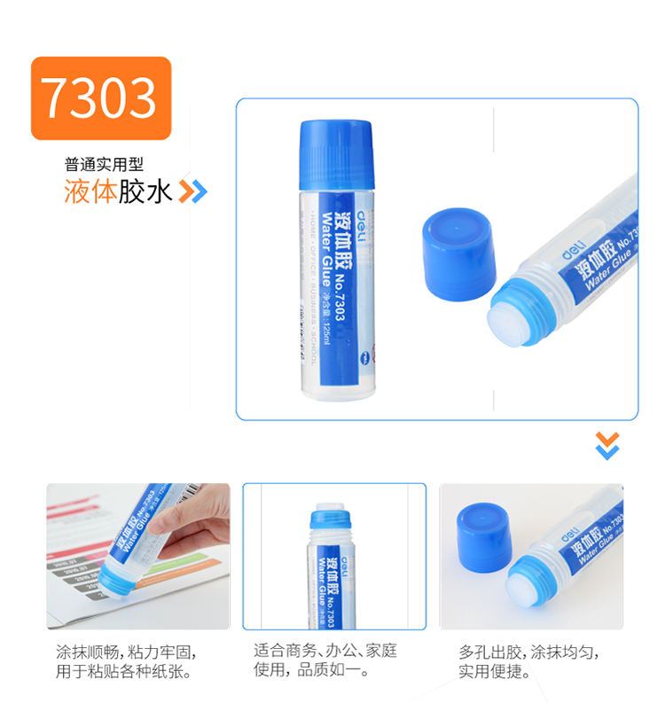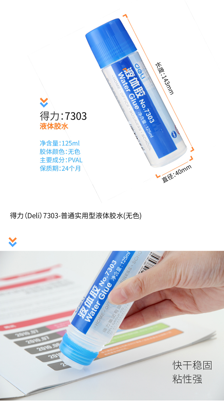 • 商品名称:得力(deli)7303 125ml高粘度液体胶 学习办公通用胶水