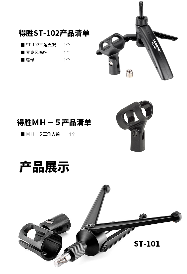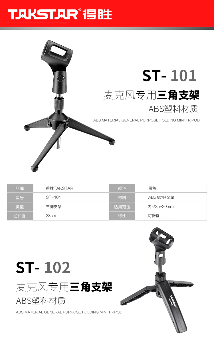 • 商品名称:得胜 ST-101 无线麦克风支架话筒夹头桌面三角架话筒支架 桌面支架 (ST-101)