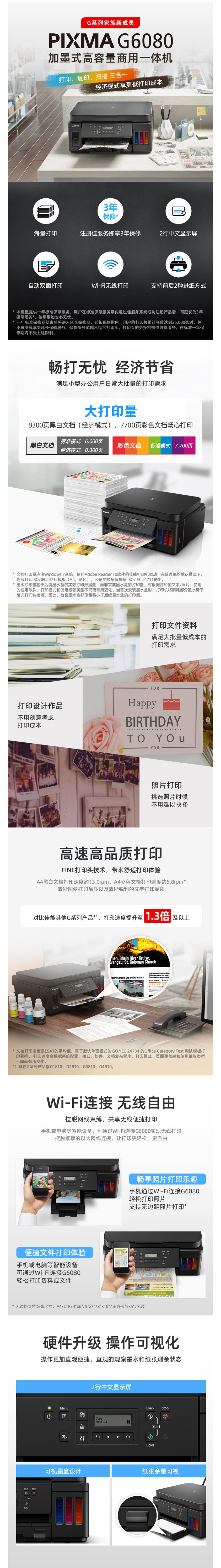 • 商品名称:佳能(Canon) G6080 加墨式高容量商用一体机 A4原装连供打印机