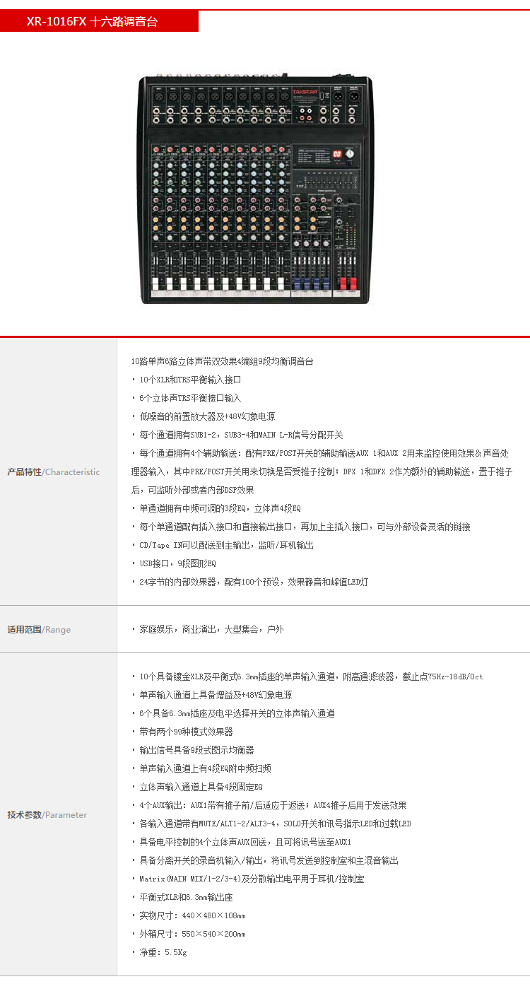 • 商品名称:得胜 XR-1016FX 调音台 十六路调音台 立体声带双效果 家庭娱乐商业演出大型集会户外