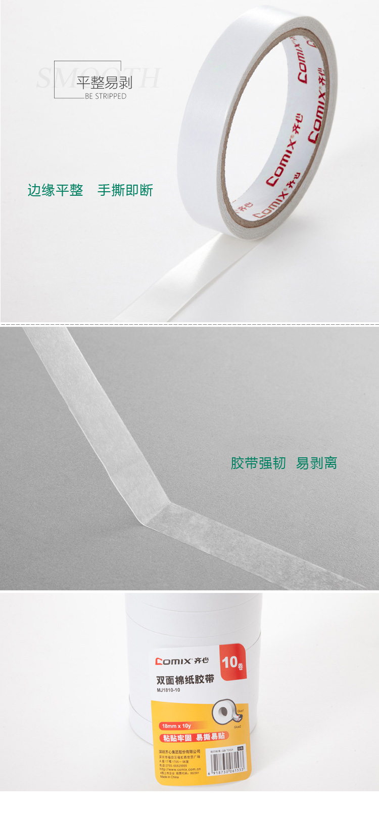 • 商品名称:齐心(COMIX) MJ1810-10 棉纸双面胶带18mm*10y(9.1米) 10卷/筒