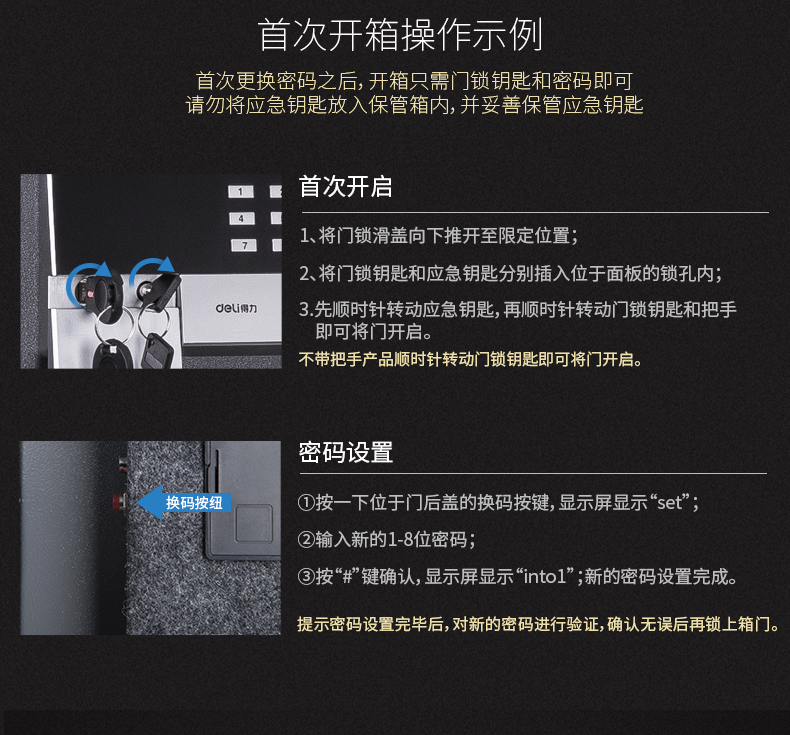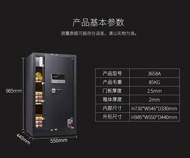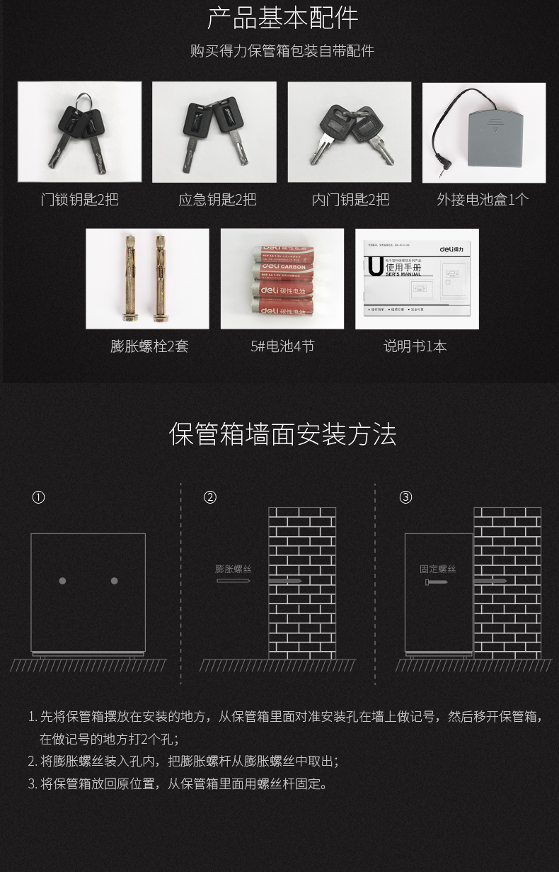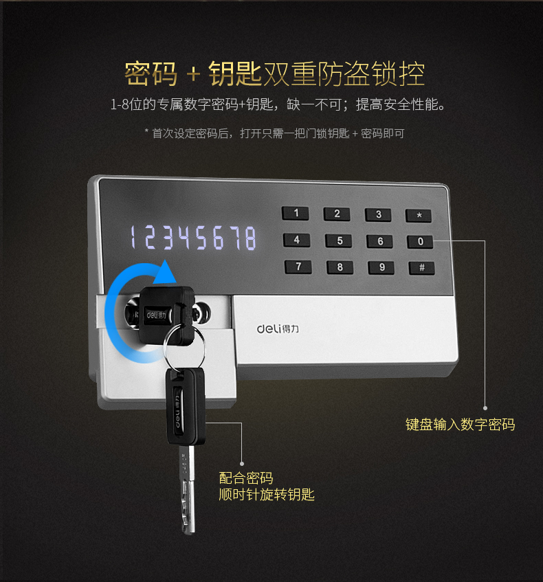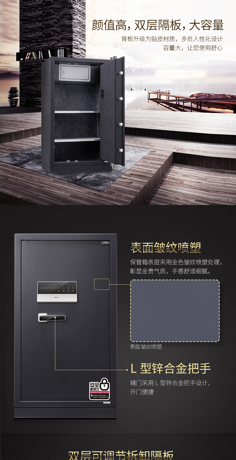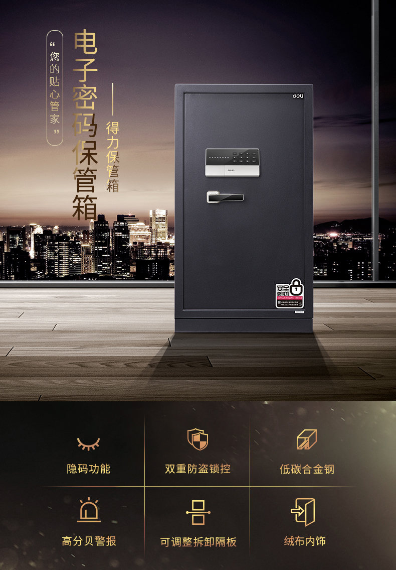 • 商品名称:得力(deli) 3658A 保管箱 电子密码保管柜 985*550*440mm (含脚轮 H100cm)