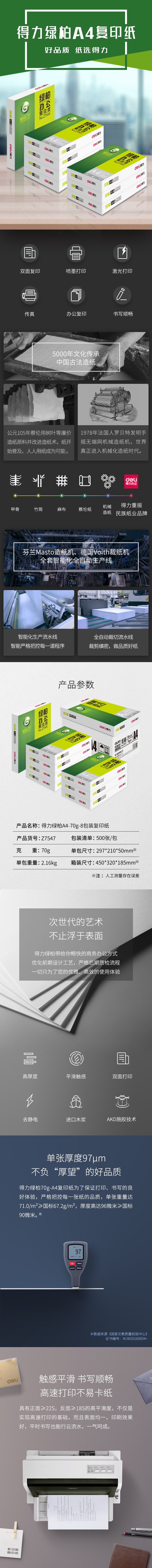 • 商品名称:得力(deli) Z7547 绿柏A4复印纸 纯木浆双面打印 70g 500张/包 8包/箱