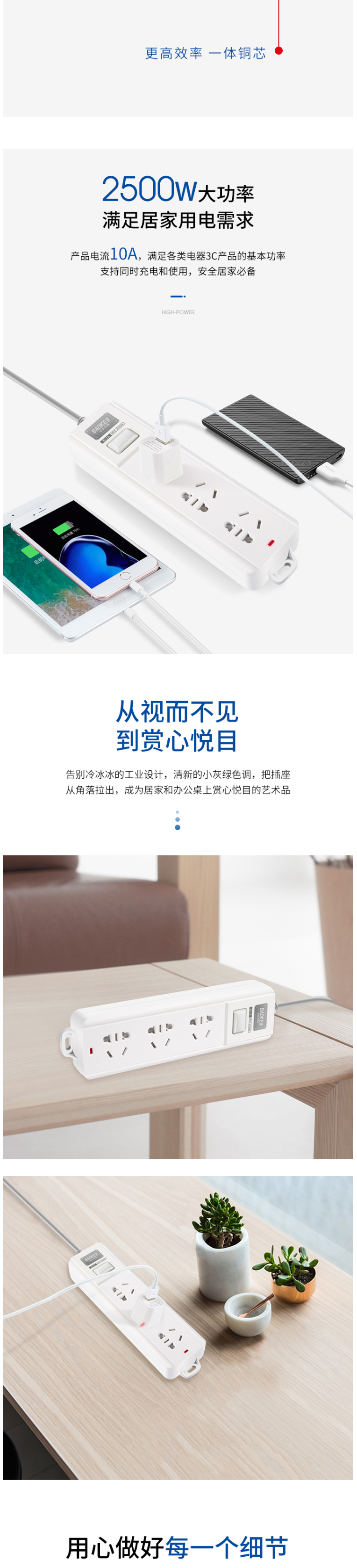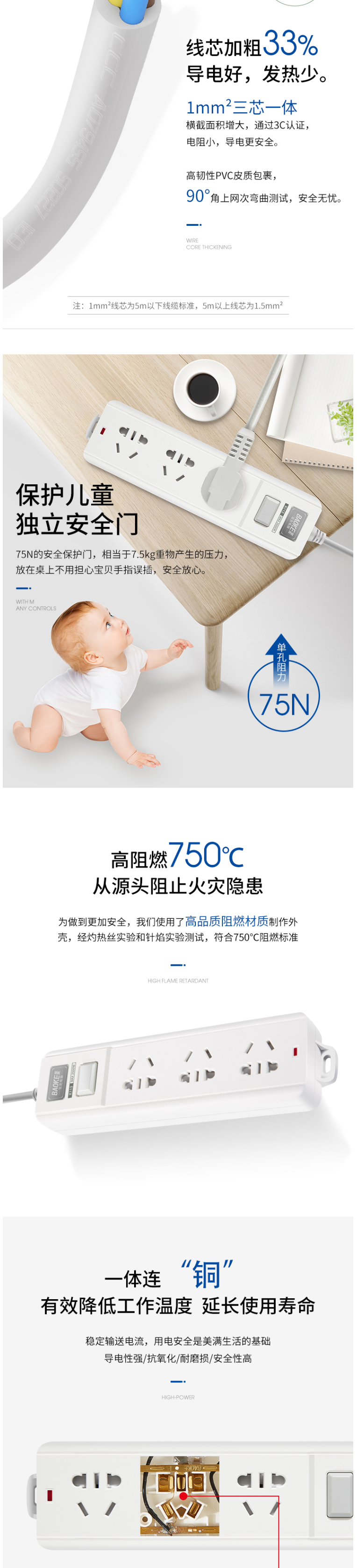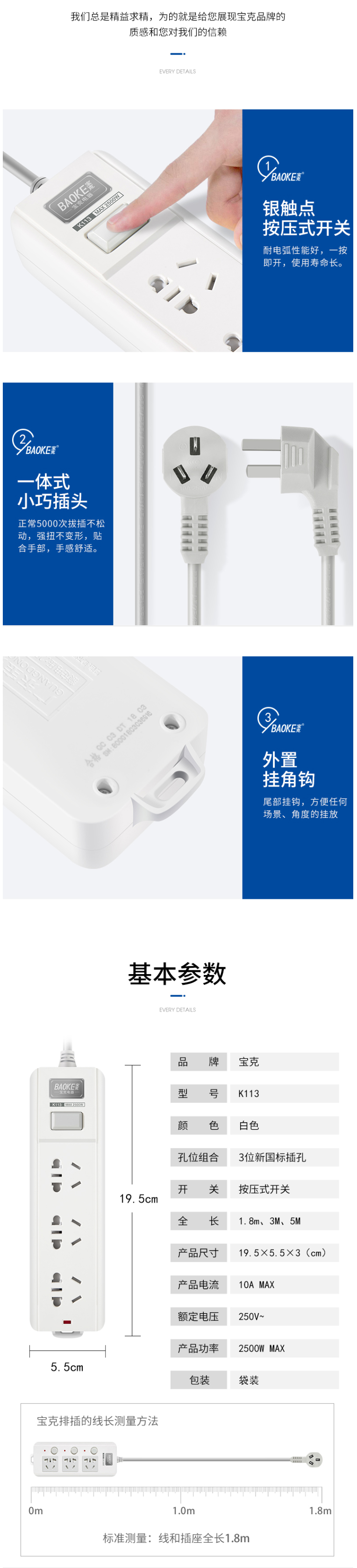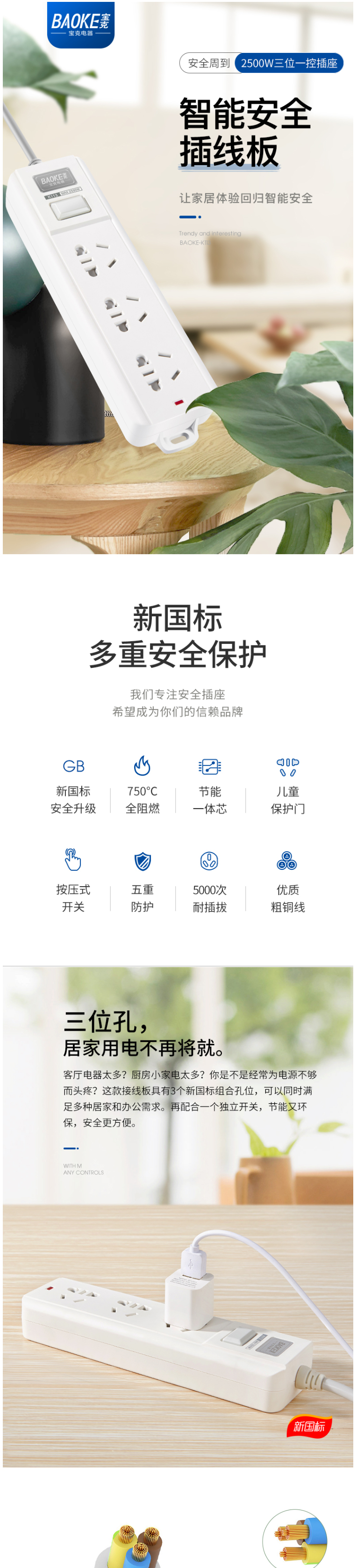 • 商品名称:宝克(BAOKE) K113-3 新国标插座/插线板/插排/拖线板 3位组合孔总控开关 (3m)