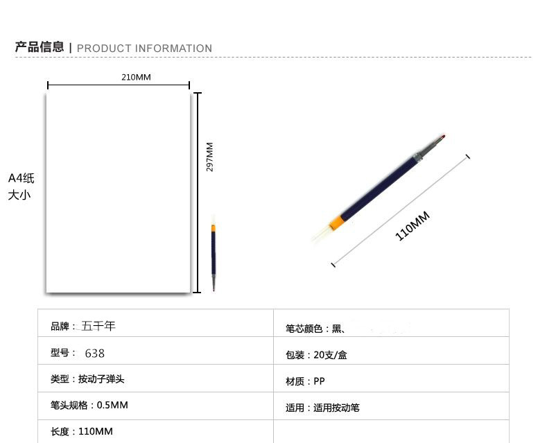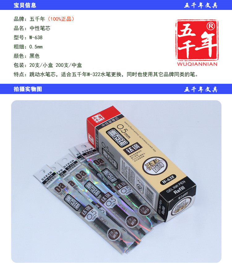 • 商品名称:五千年 W-638 替芯按动中性笔笔芯黑0.5mm水笔芯 黑色子弹头按动式替芯 20支/盒