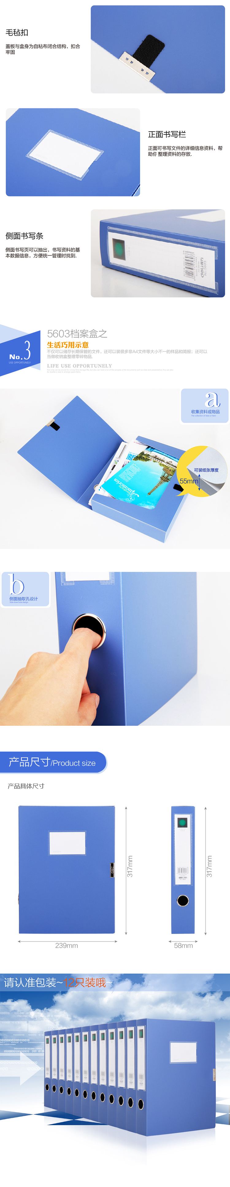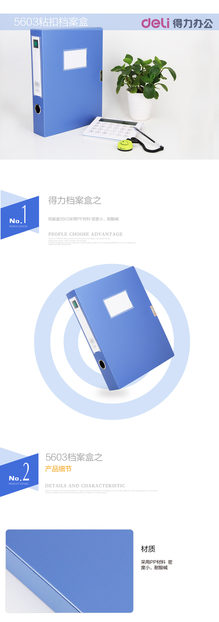 • 商品名称:得力(deli) 5603 档案盒 加厚大容量PP粘扣档案盒 A4 55mm 12个/件(蓝色)