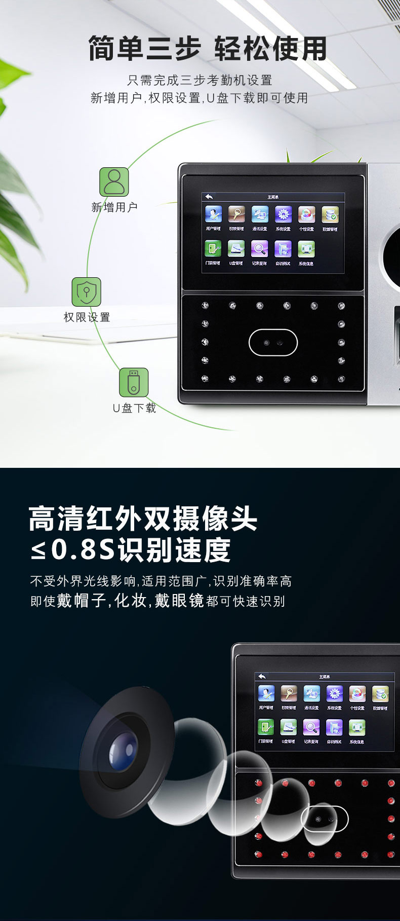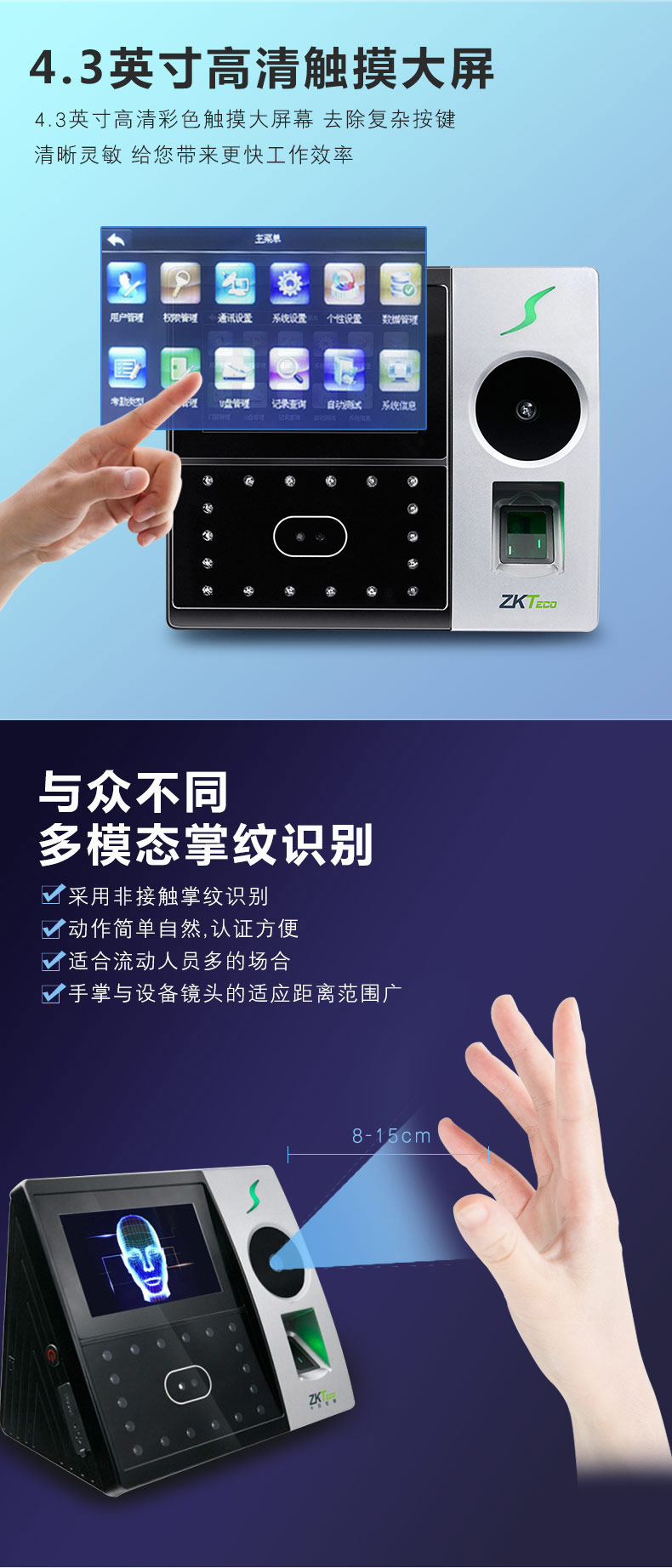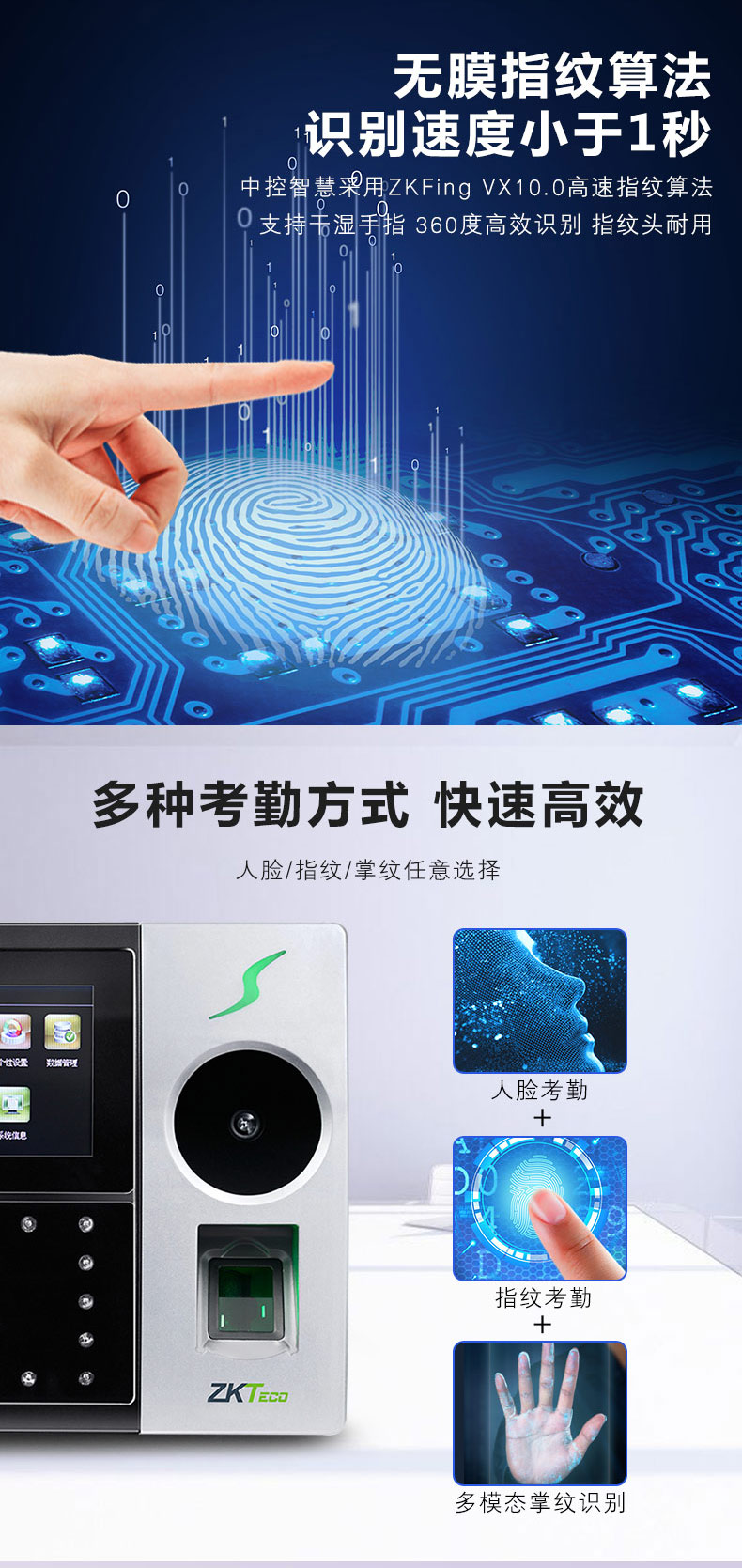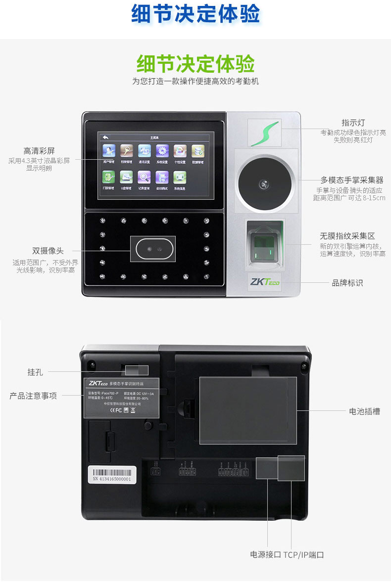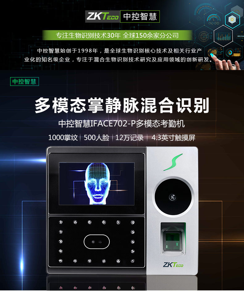 中控智慧(ZKTeco) iFace702-P 人脸指纹掌静脉混合识别考勤机 智能WIFI大容量高速打卡机