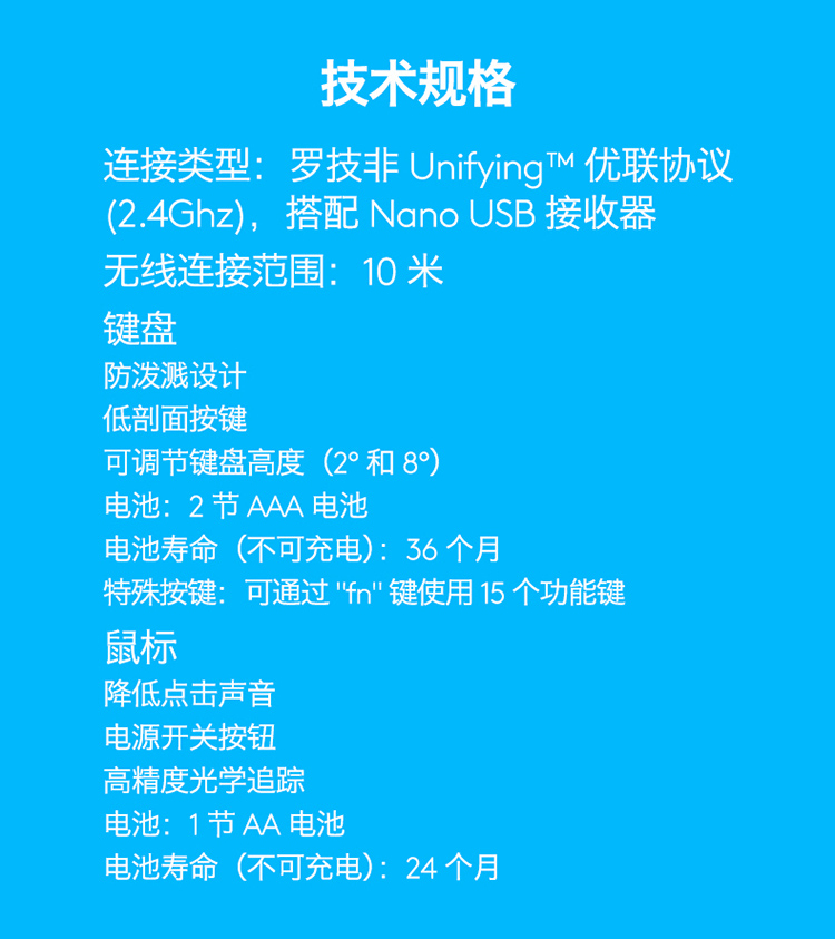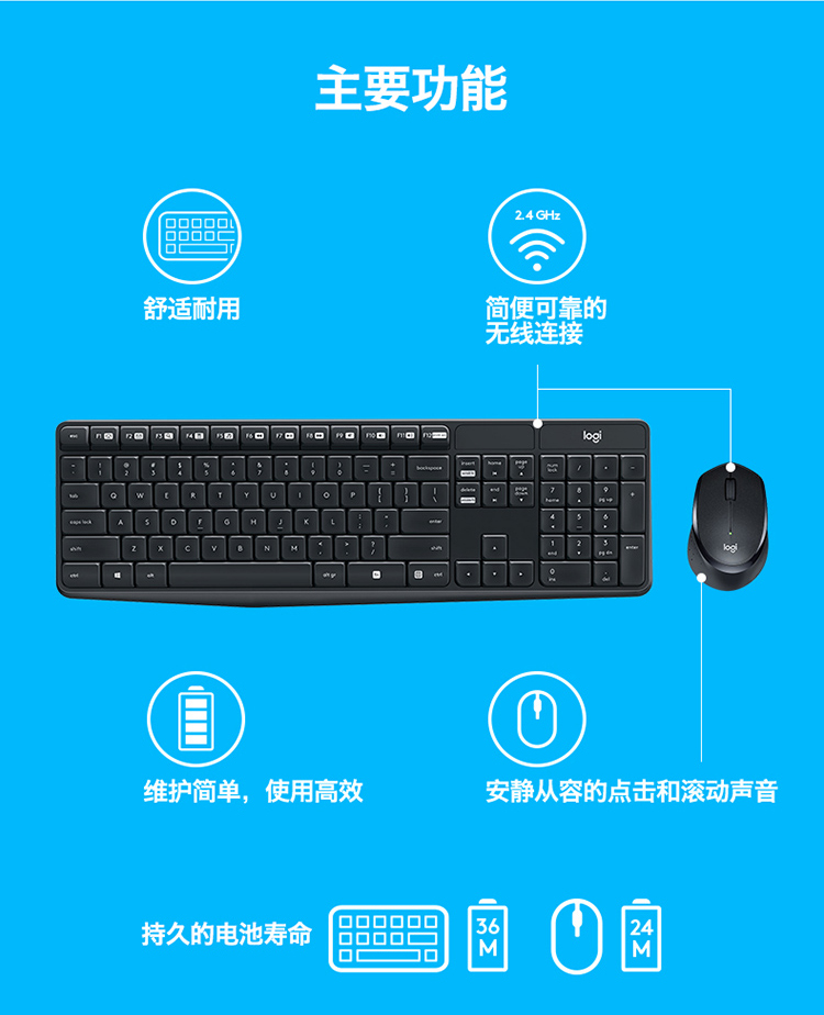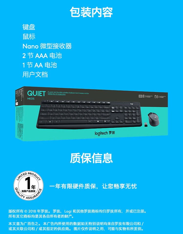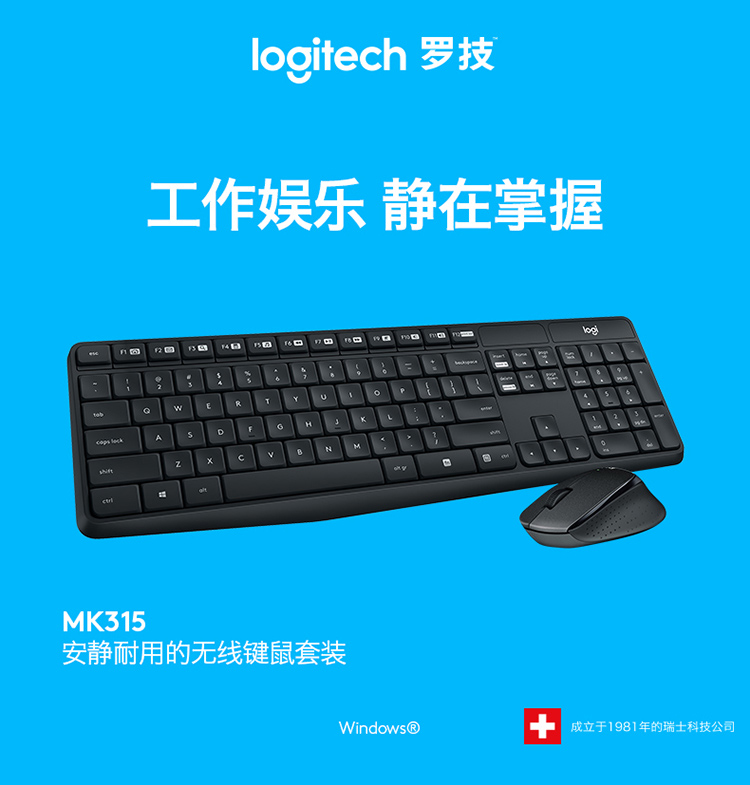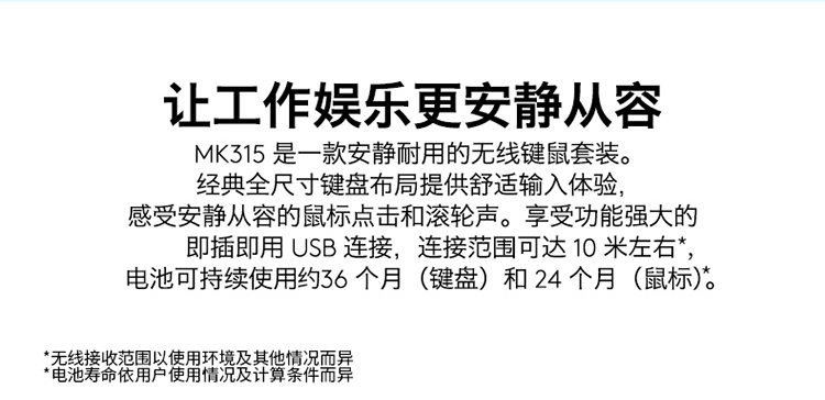• 商品名称:罗技(Logitech) MK315 无线键鼠套装 安静输入 防泼溅 黑色