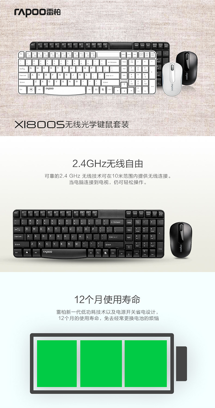 • 商品名称:雷柏(Rapoo) X1800S 无线鼠标键盘套装 无线键盘鼠标套装 无线键鼠套装 电脑键盘 笔记本键盘 白色
