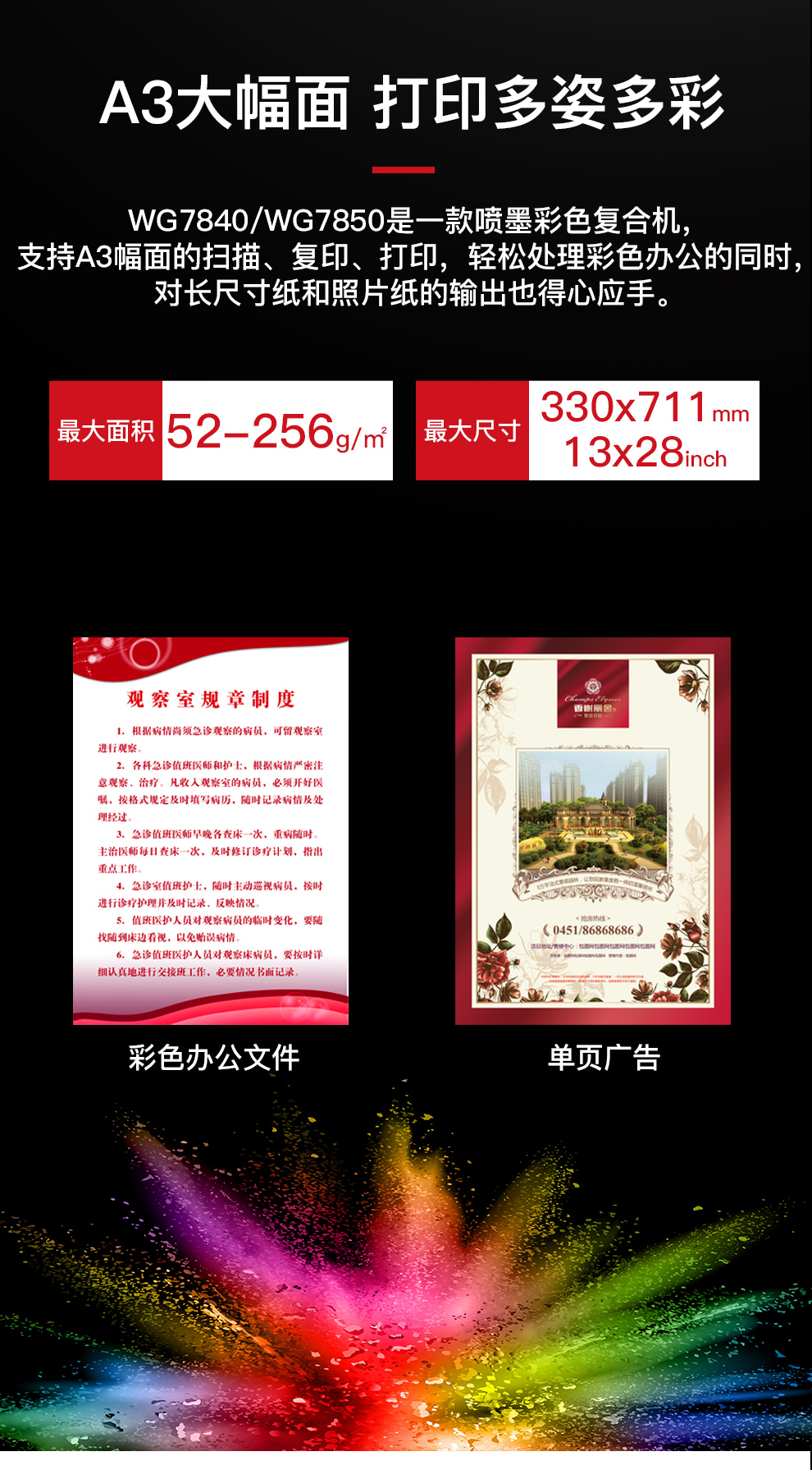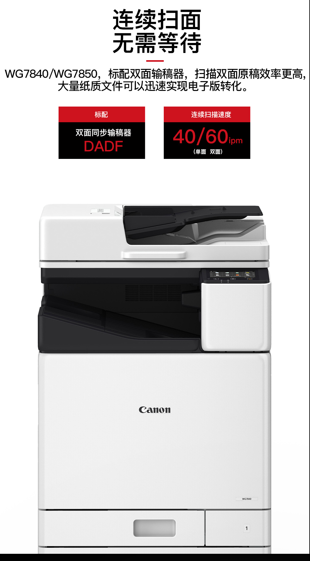 • 商品名称:佳能(Canon) WG7850 A3彩色喷墨复合机一体机打印机 标配双面同步输稿器+双面器