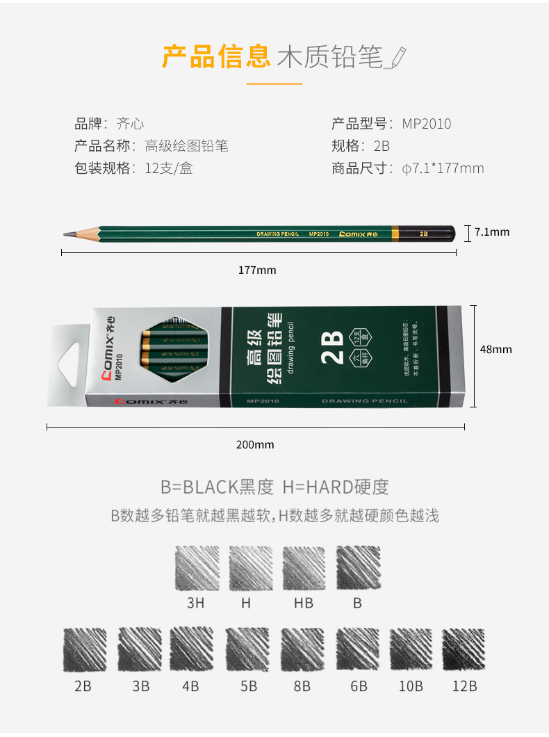 • 商品名称:齐心(COMIX) MP2010 2B铅笔木质铅笔学生铅笔 12支/盒