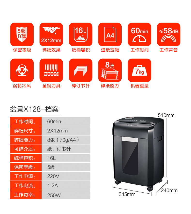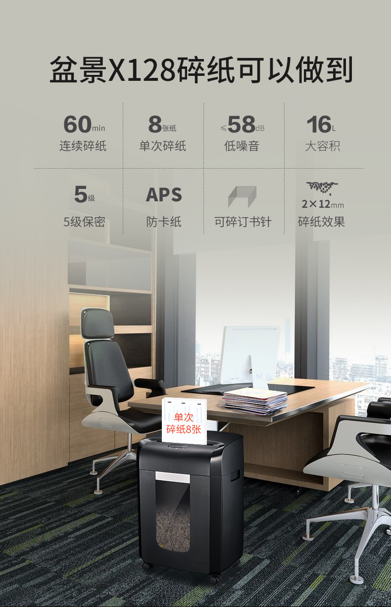 • 商品名称:盆景(bonsaii)X128 碎纸机 德国5级中型高保密长时间办公商用碎纸机 颗粒文件粉碎机