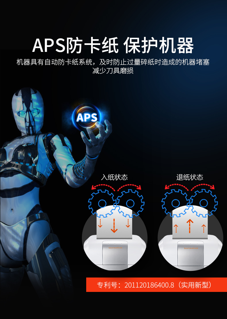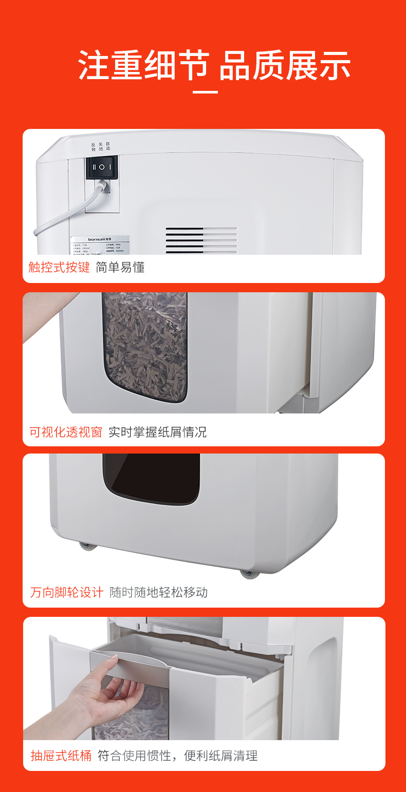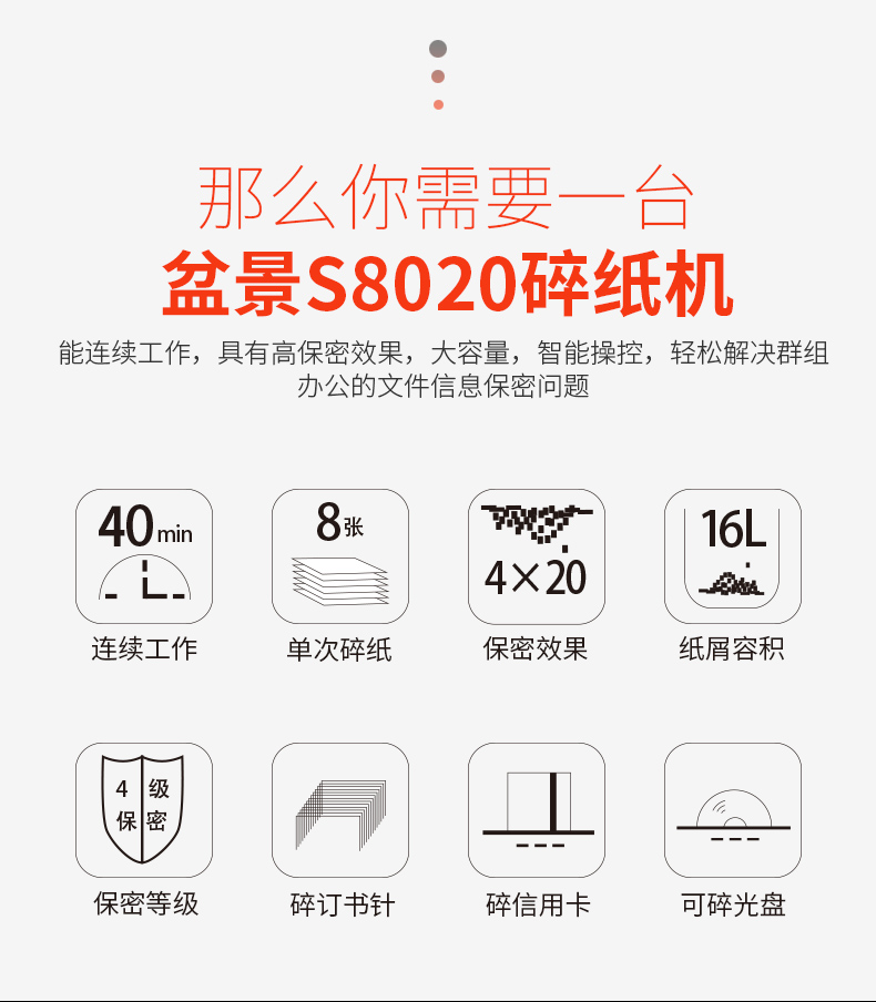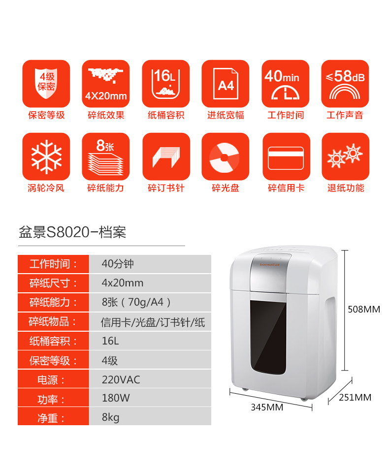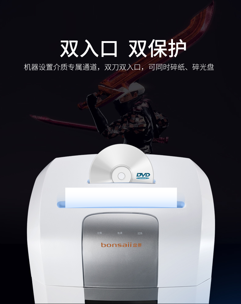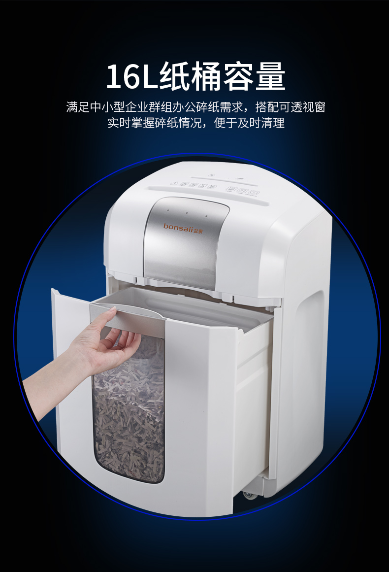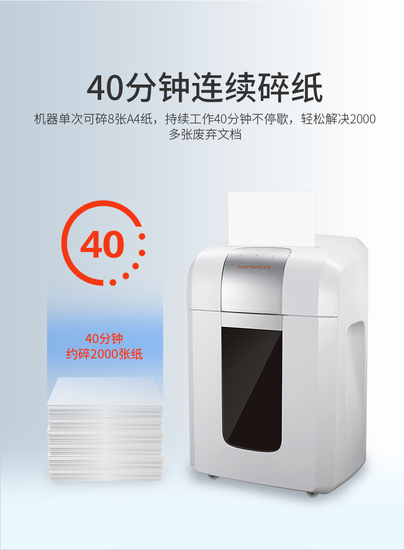 • 商品名称:盆景(bonsaii)S8020 碎纸机 中型德国4级保密双入口长时间办公碎纸机 光盘信用卡粉碎机
