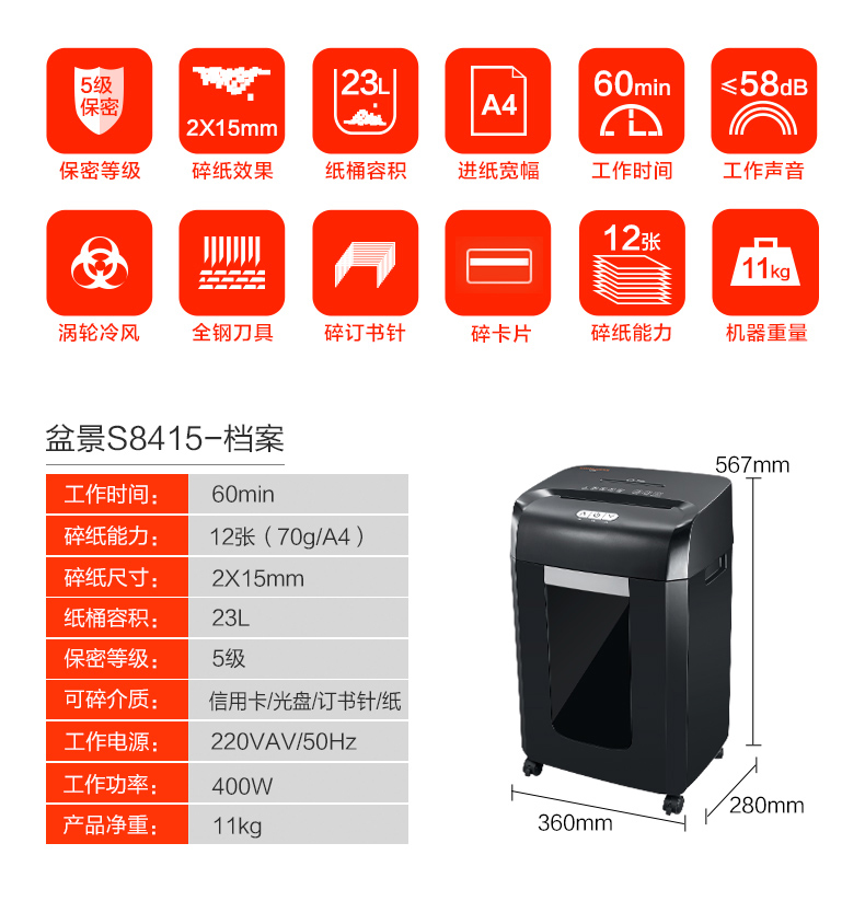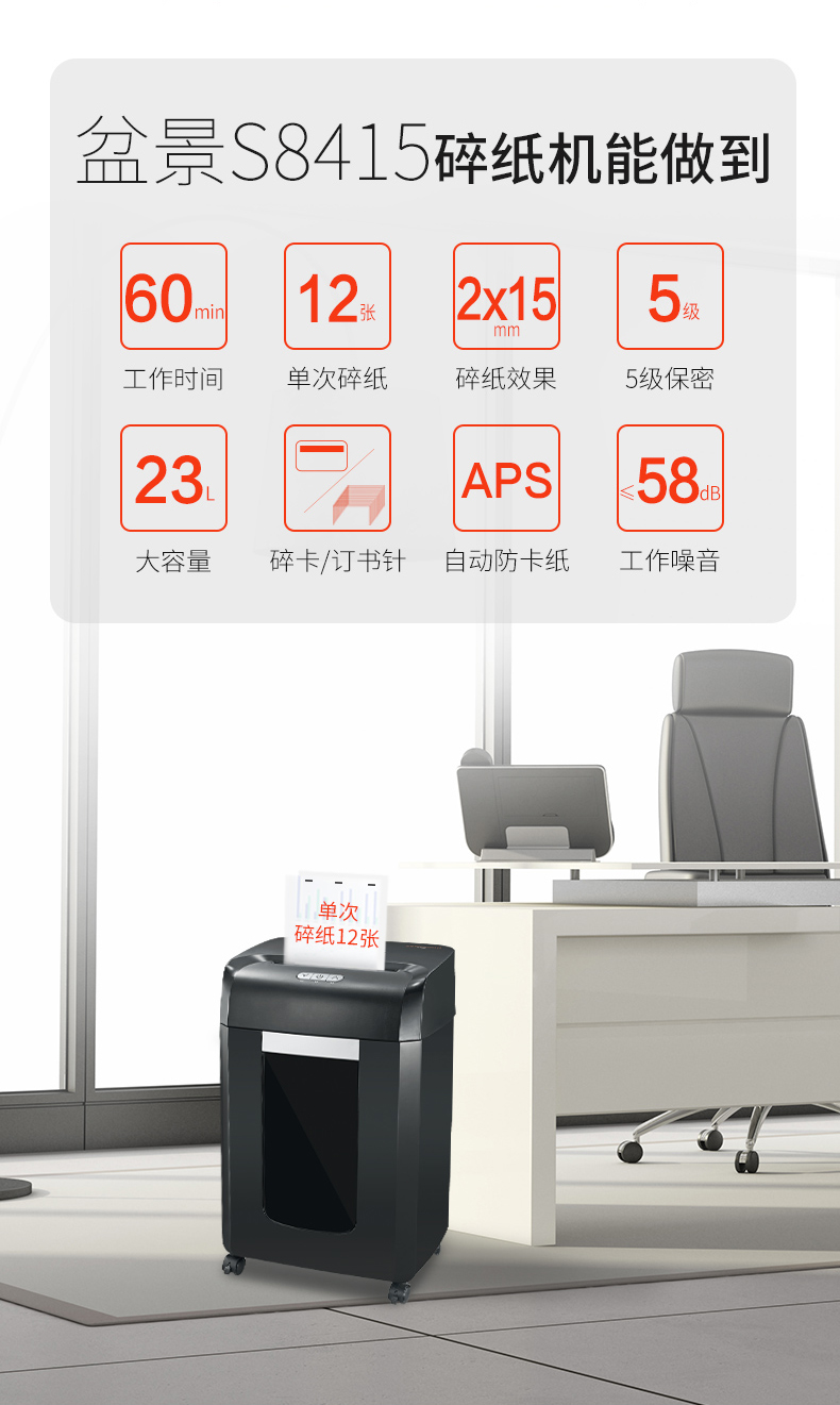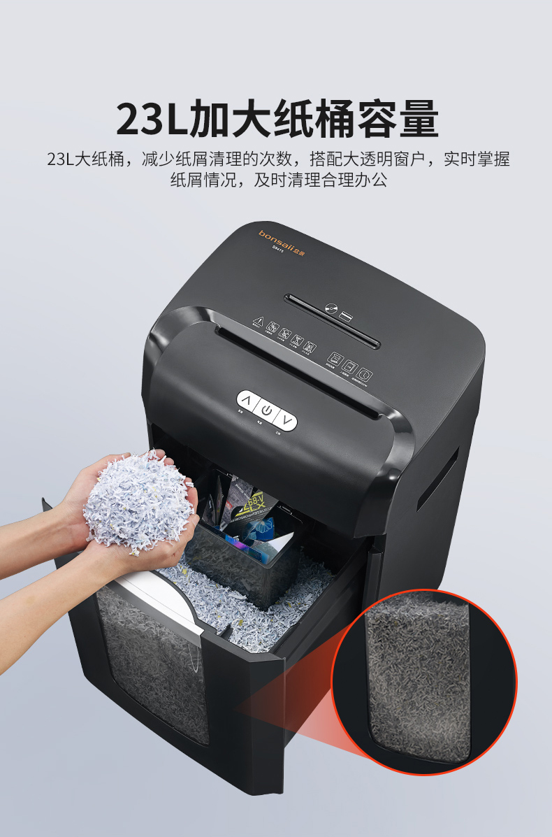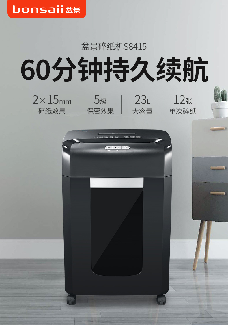 • 商品名称:盆景(bonsaii)S8415 高保密中型长时间办公碎纸机 大容量文件粉碎机 可碎纸/卡/光盘