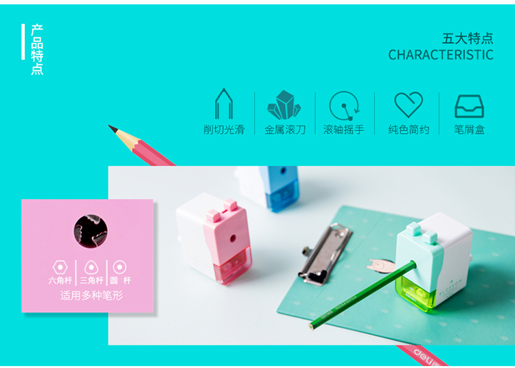 • 商品名称:得力(deli) 0744 简约式削铅笔机/削笔机//卷笔刀彩色学生削笔器 粉蓝色