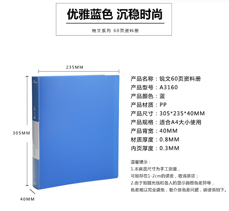 • 商品名称:广博(GuangBo)A3160 A4/60页PP资料册/文件册/档案册/办公用品