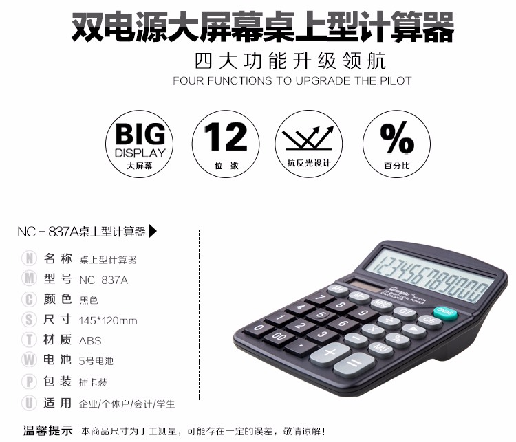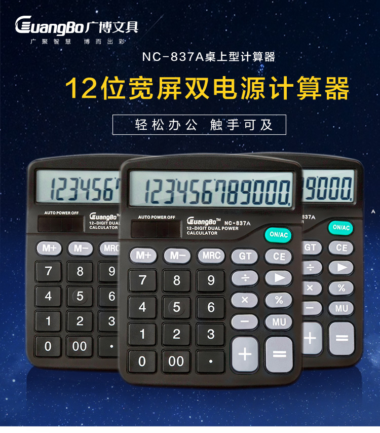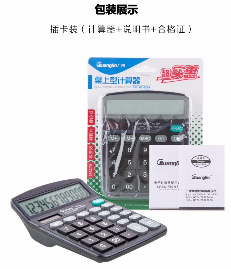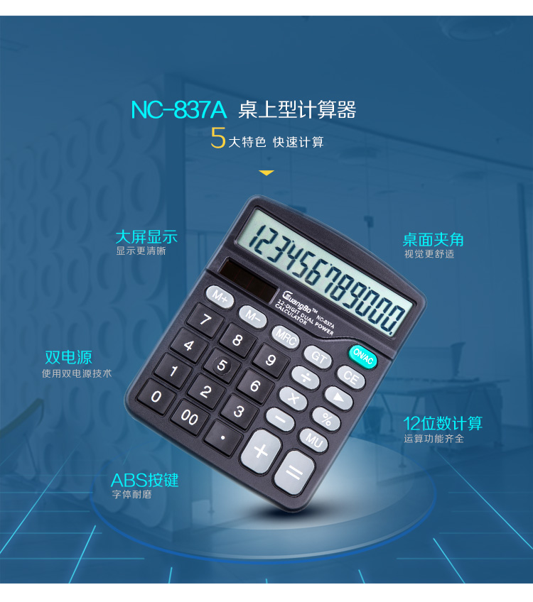 • 商品名称:广博(GuangBo)NC-837A 12位大屏幕太阳能计算器桌面计算机