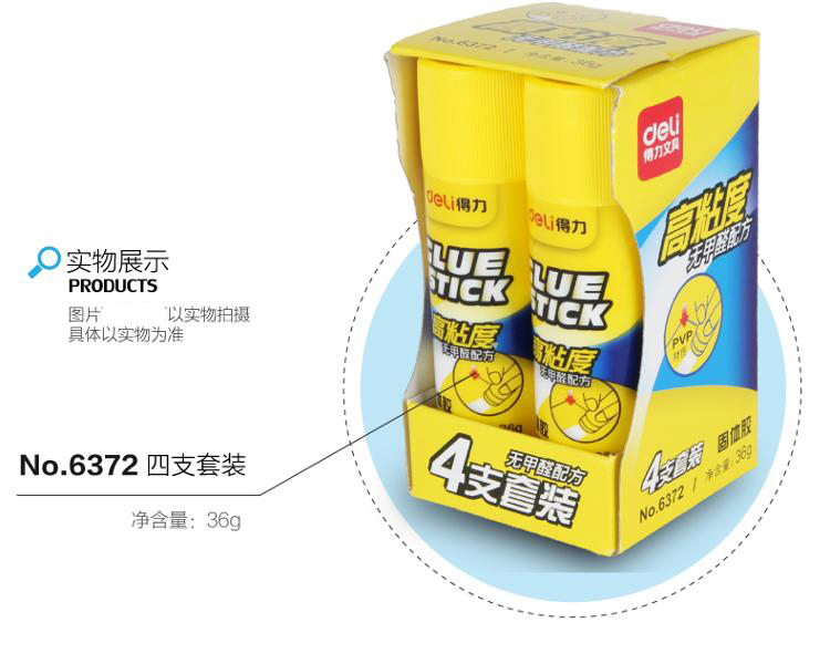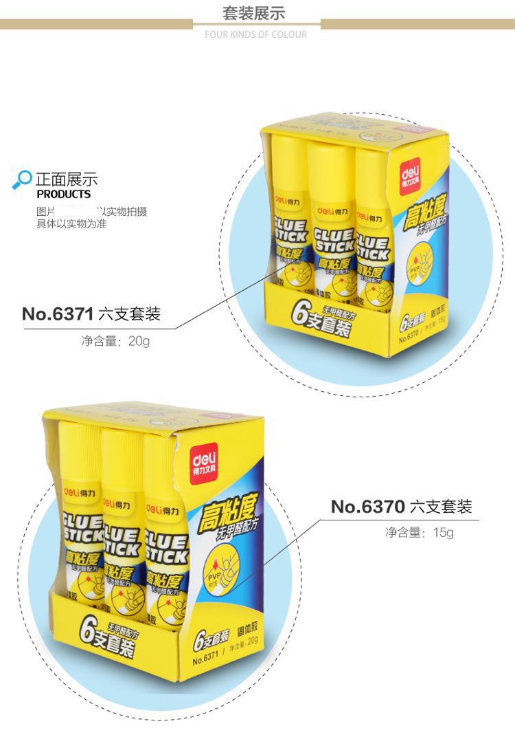 • 商品名称:得力(deli)6371 pvp无甲醛高粘度固体胶 20g/支 6支组合装