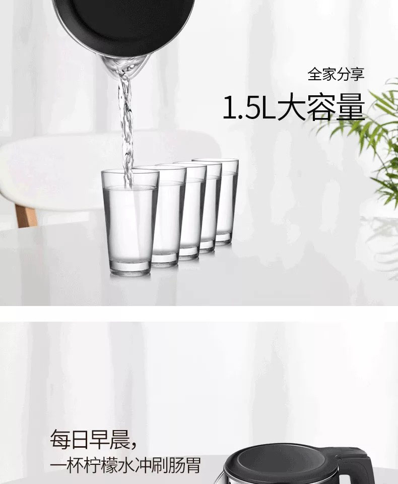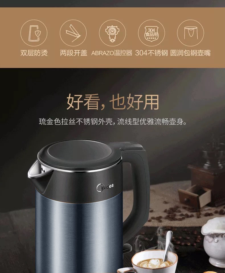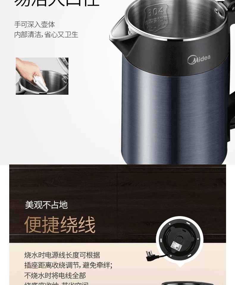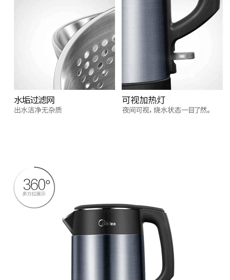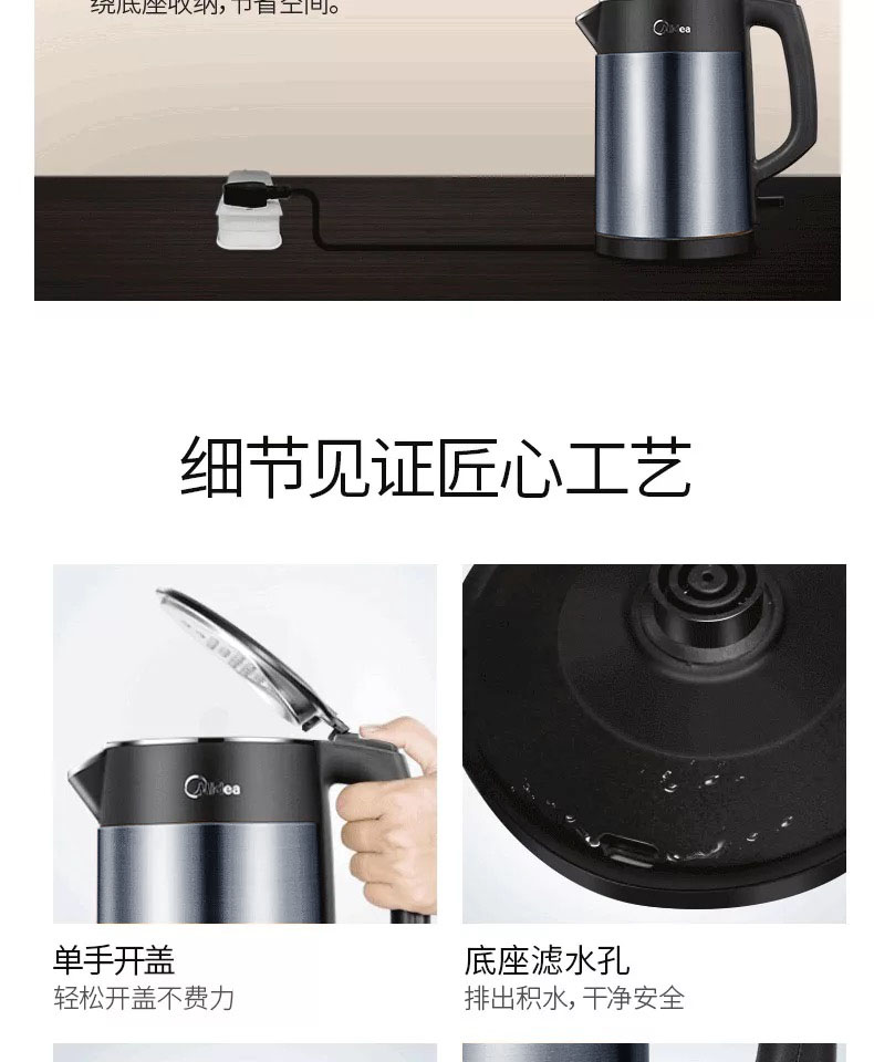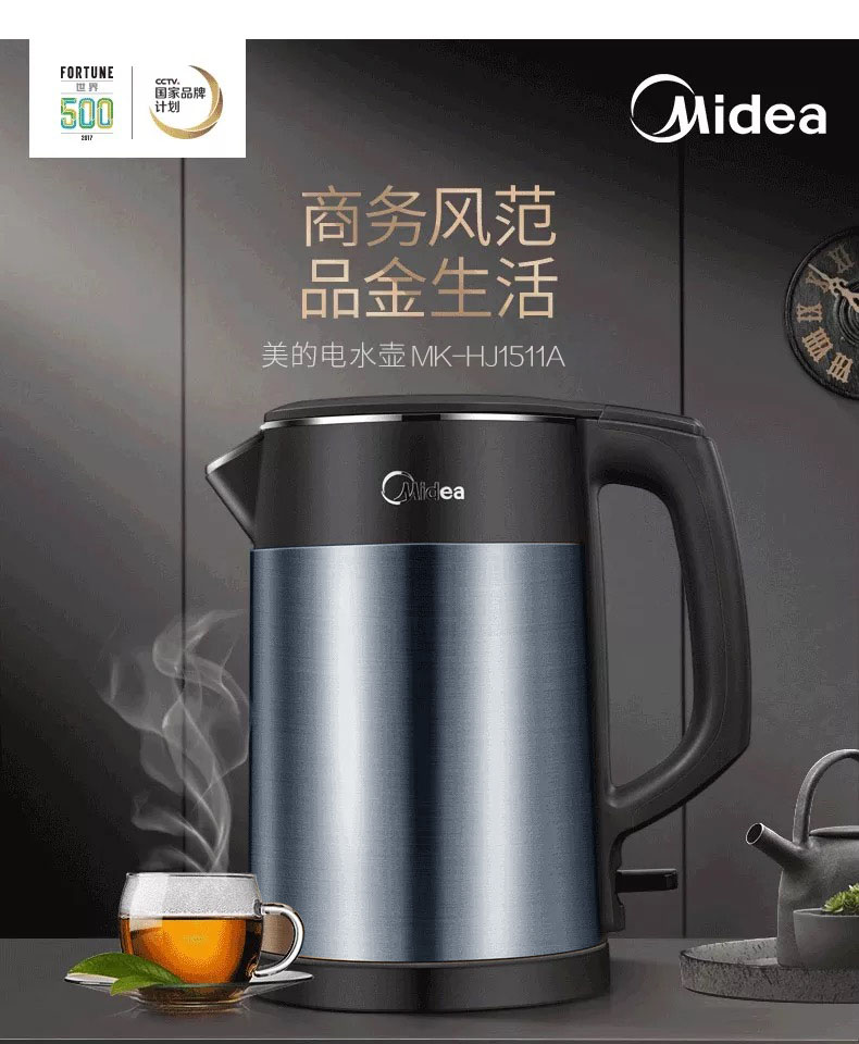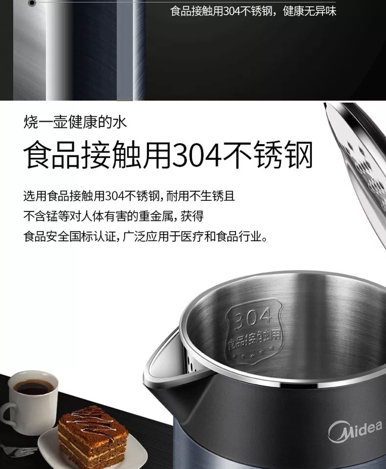 • 商品名称:美的(Midea)HJ1511a 电水壶 热水壶 电热水壶烧水壶304不锈钢一体无缝 1.5L