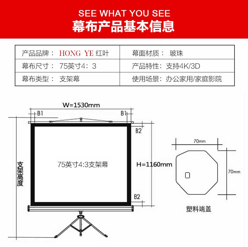 • 商品名称:红叶(Red Leaf)75英寸4:3玻珠支架投影幕布投影布 家用投影仪幕布