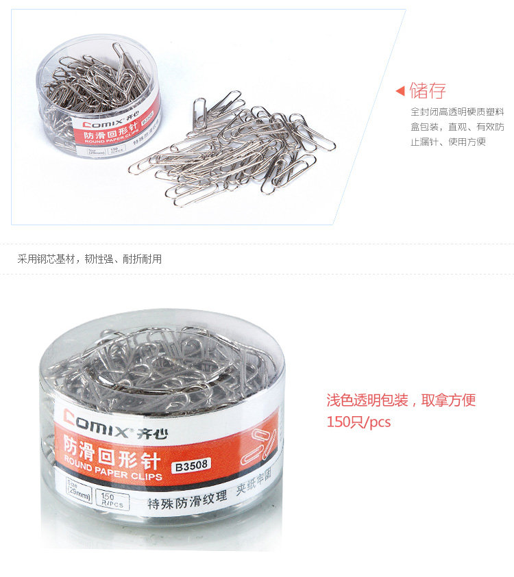 • 商品名称:齐心(Comix) B3508 3#防滑纹回形针/曲别针 150枚/筒