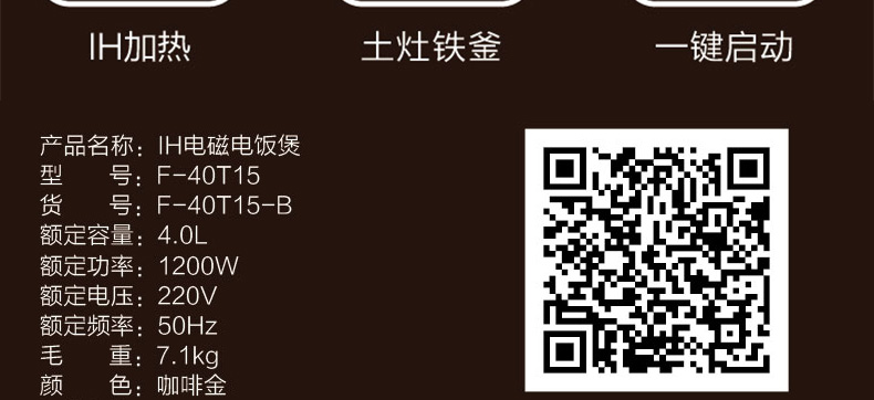 • 商品名称:九阳(Joyoung) 40T15 电饭煲电饭锅 铁釜内胆 智能预约 触摸式 4L
