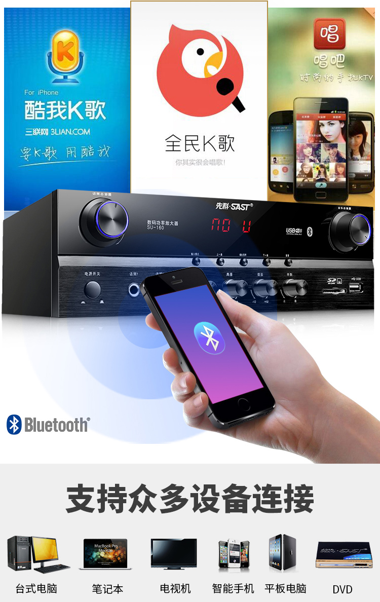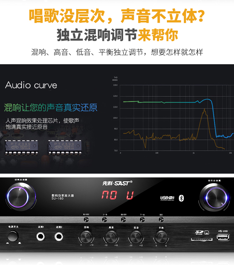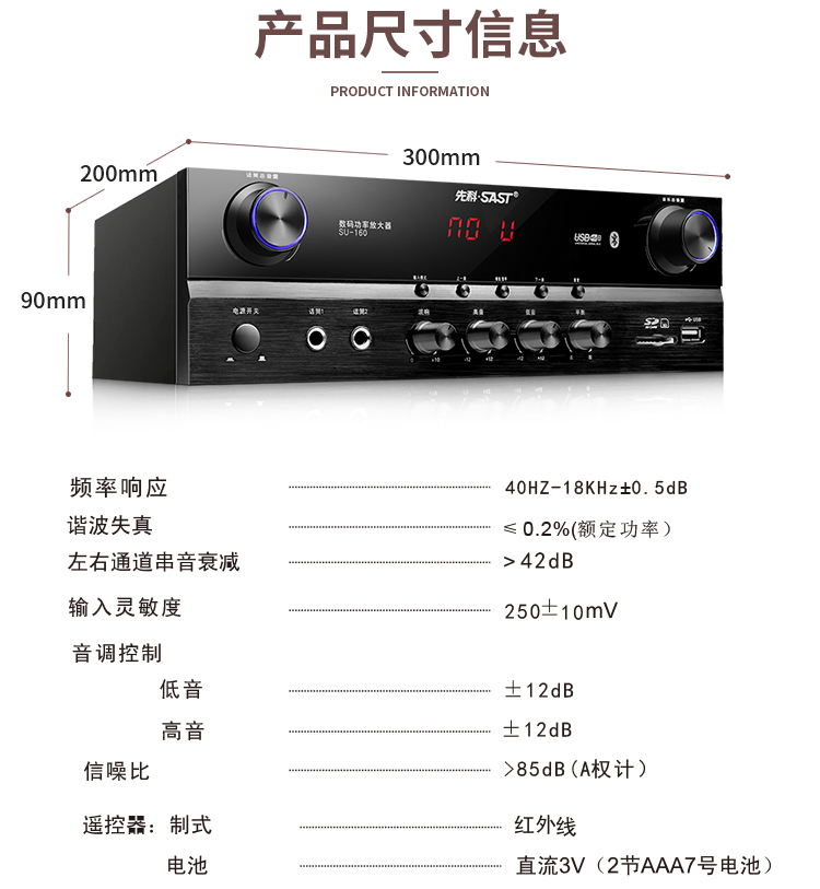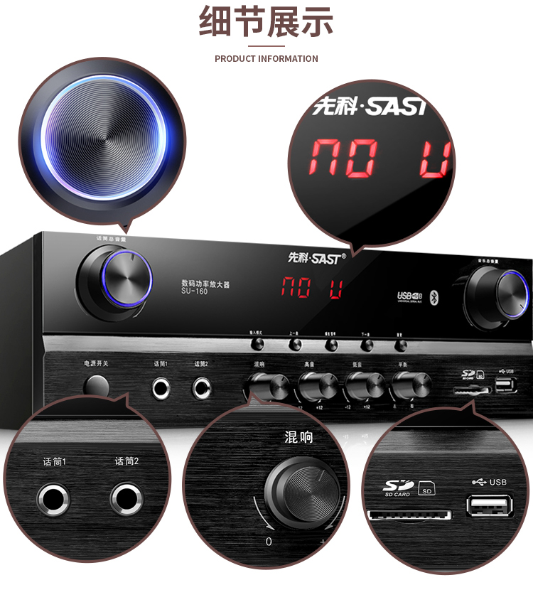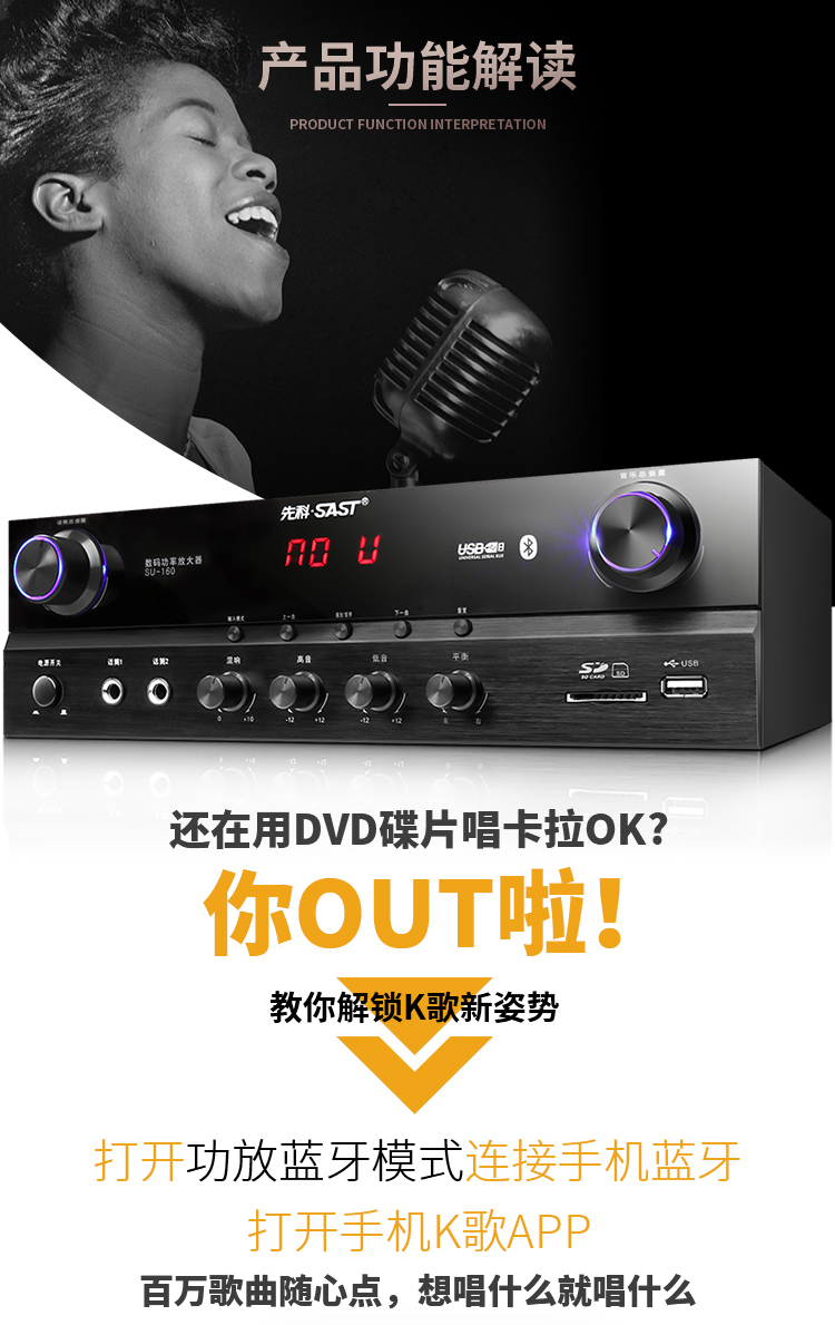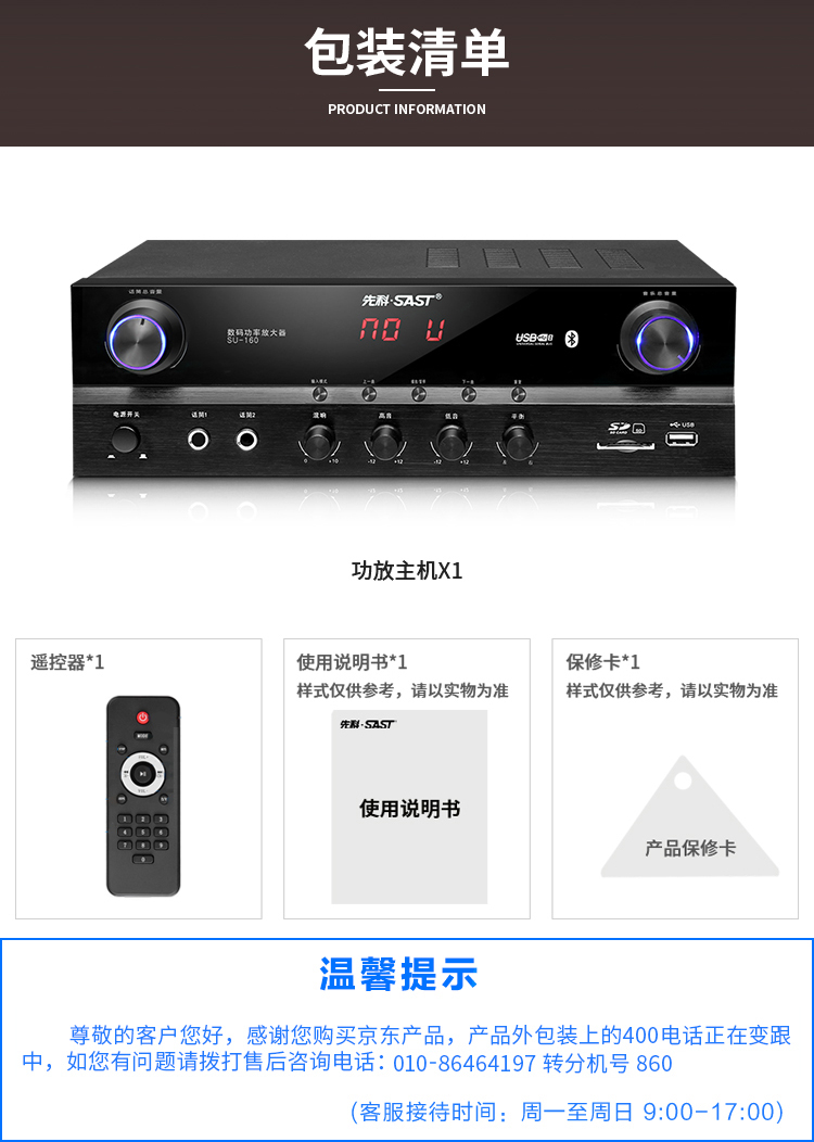 • 商品名称:先科(SAST)SU-160 定阻功放机 家庭影院ktv音箱套装卡包蓝牙音响(黑色)