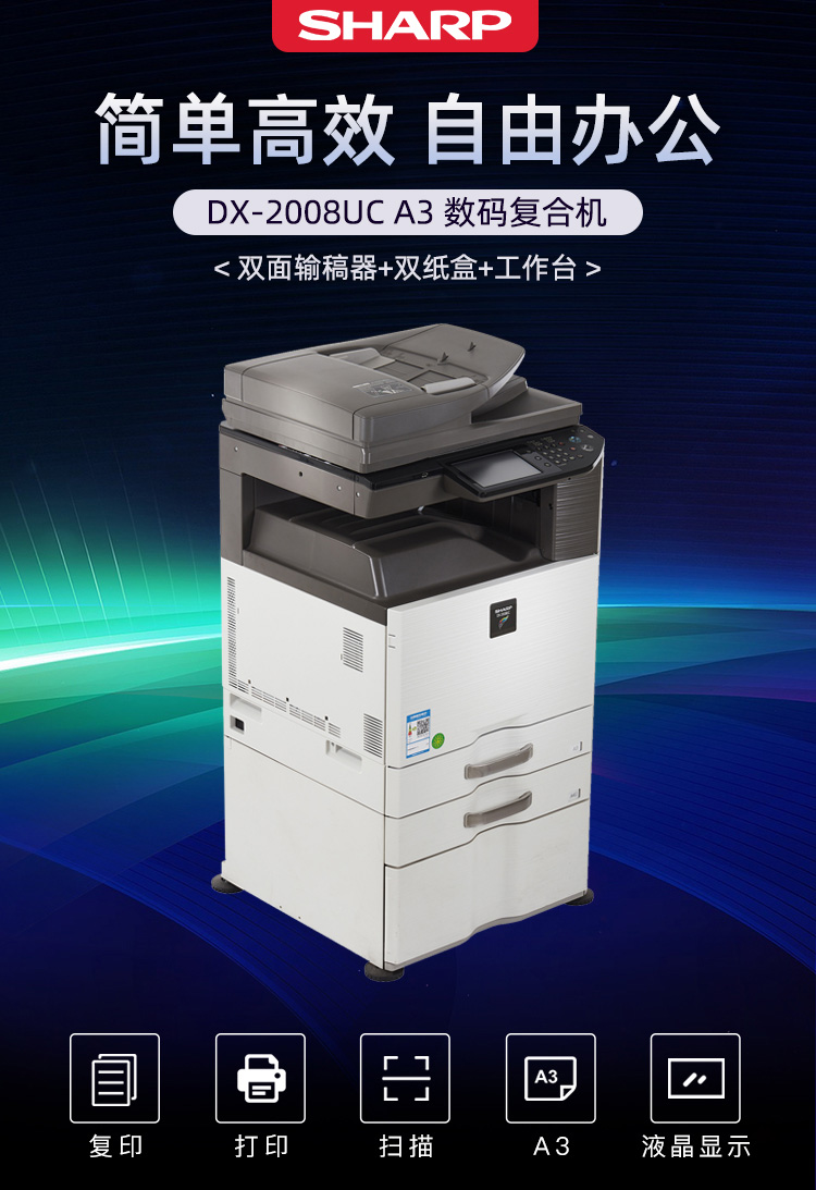 • 商品名称:夏普(SHARP)DX-2008UC A3彩色数码复合机激光打印一体机(含双面输稿器+双纸盒+工作台)