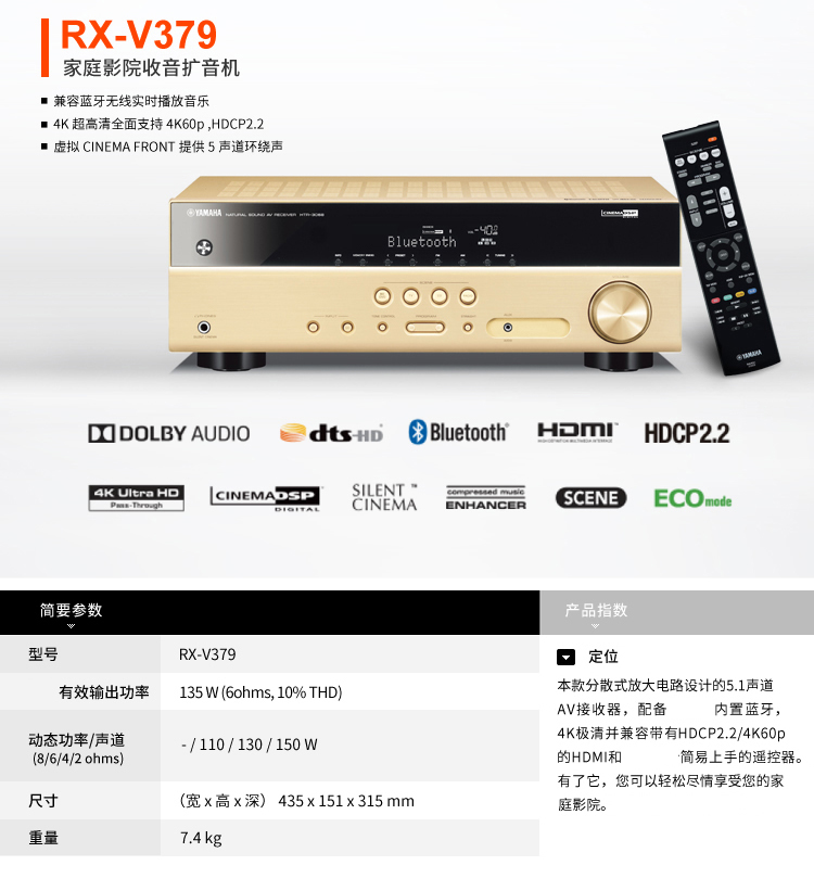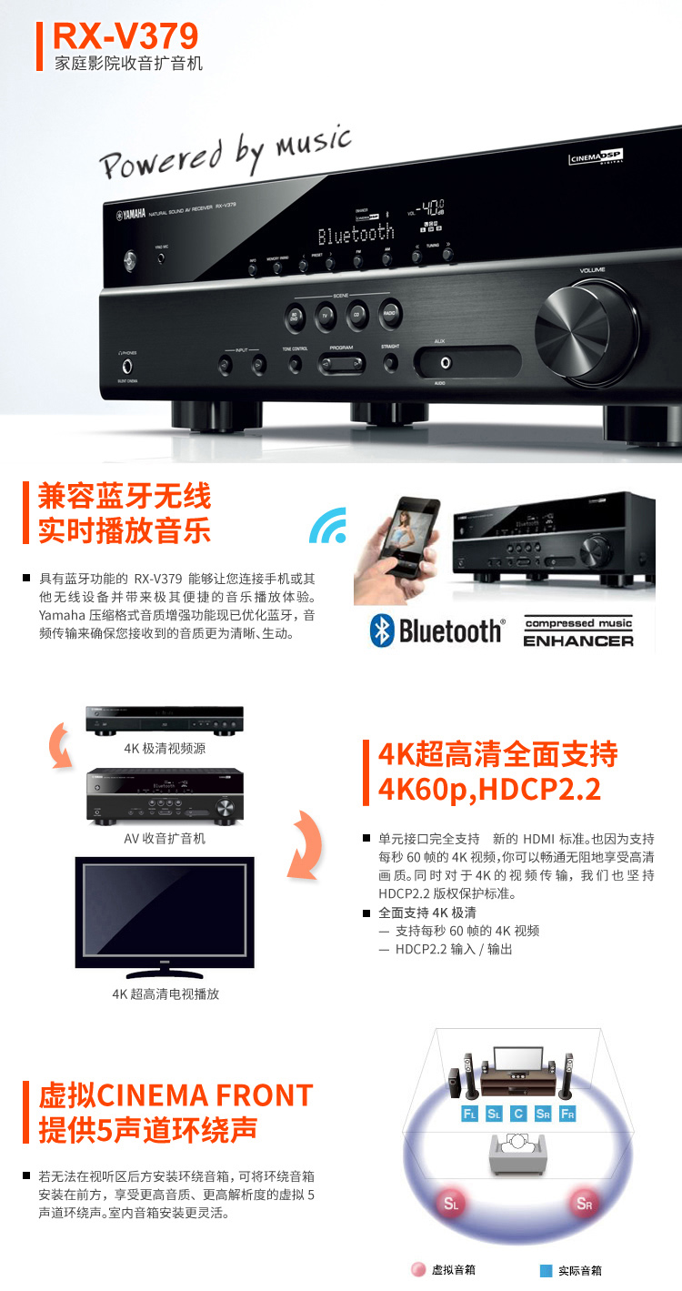 • 商品名称:雅马哈(Yamaha)RX-V379 音响音箱 家庭影院5.1声道AV功放机 4K 杜比 DTS 蓝牙 黑色