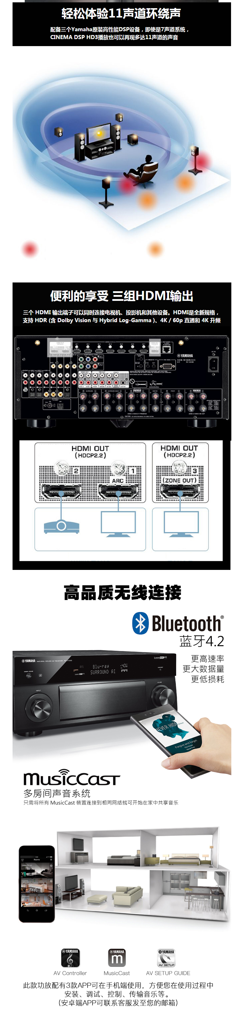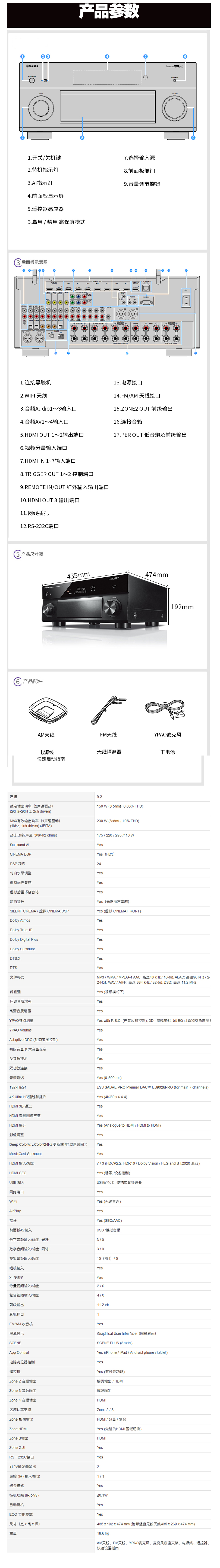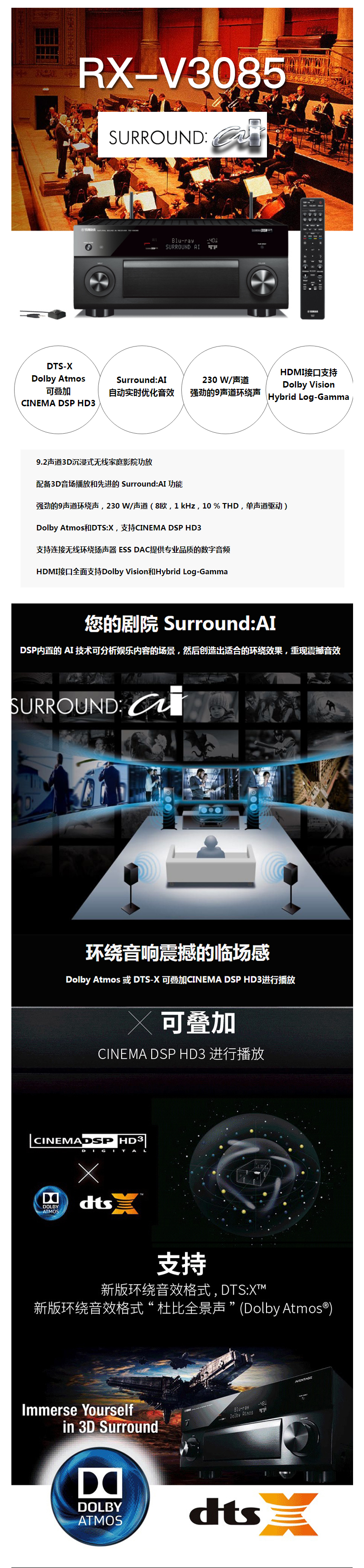 • 商品名称:雅马哈(Yamaha)RX-V3085 音响音箱 家庭影院9.2声道AV功放机 4K杜比全景声DTS:X 蓝牙WIFI 黑色