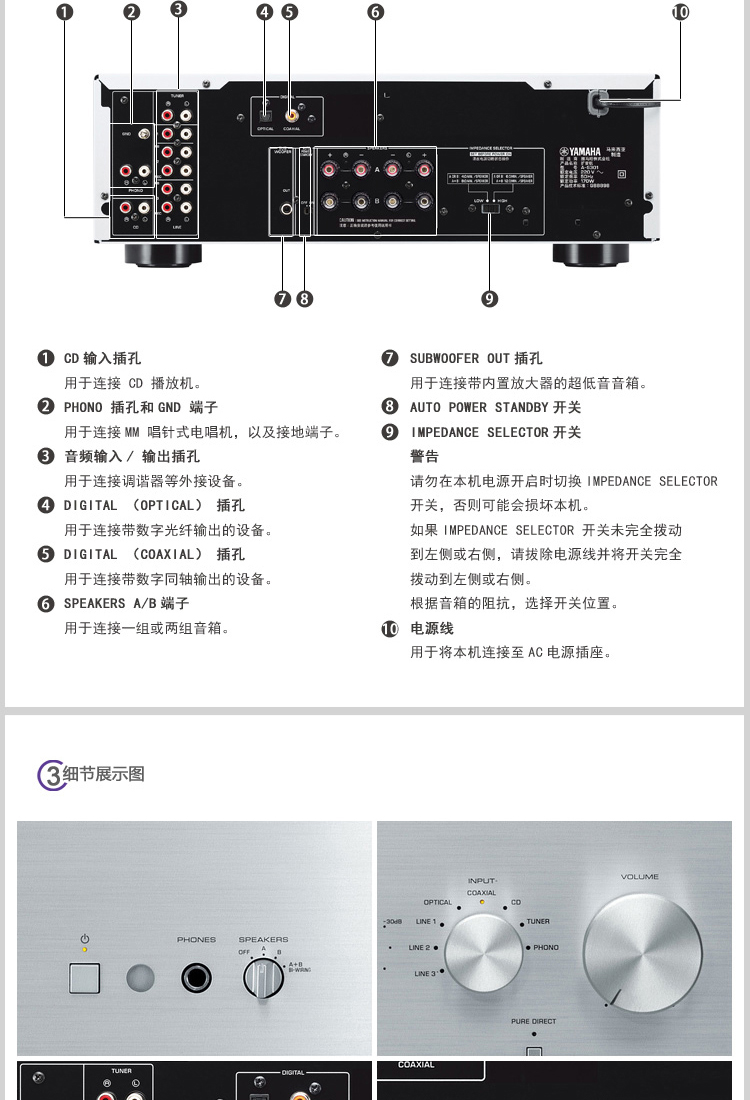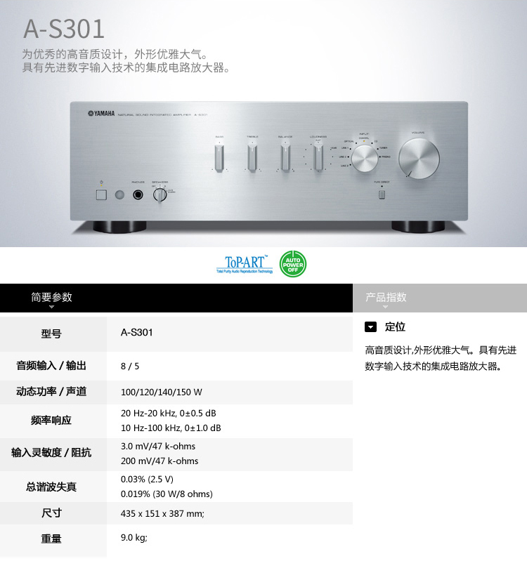 • 商品名称:雅马哈(Yamaha)A-S301 音响音箱 高保真 2.1声道立体声功放 HIFI 发烧级 数字输入