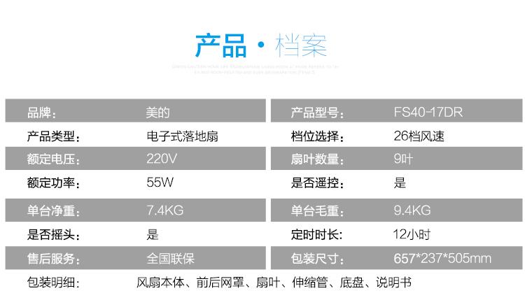 • 商品名称:美的(Midea) FS40-17DR 电风扇/变频静音落地扇 九叶扇叶遥控式风扇 26档风速16寸