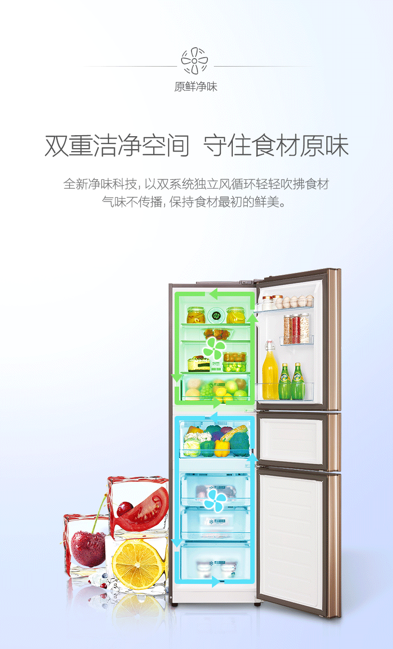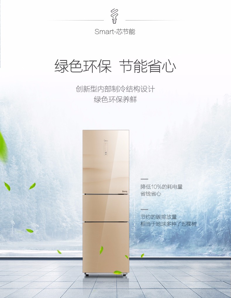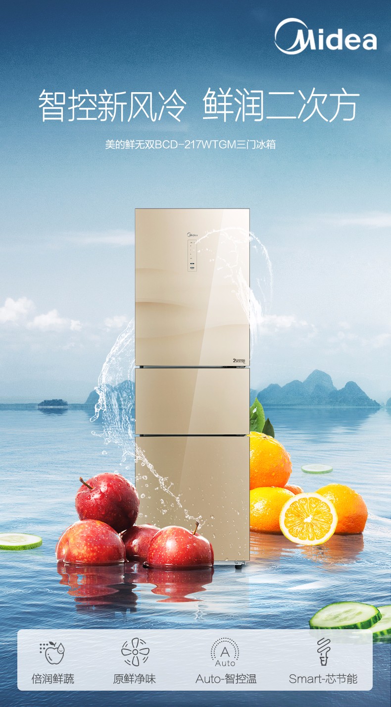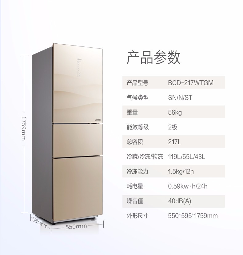 • 商品名称:美的(Midea) BCD-217WTGM 三门冰箱 家用节能 冷藏冷冻 静音 除臭除霜