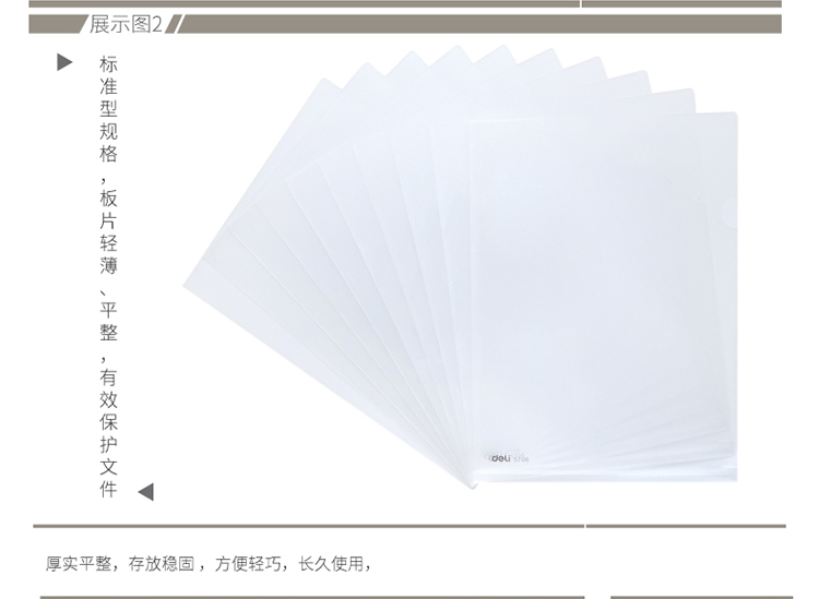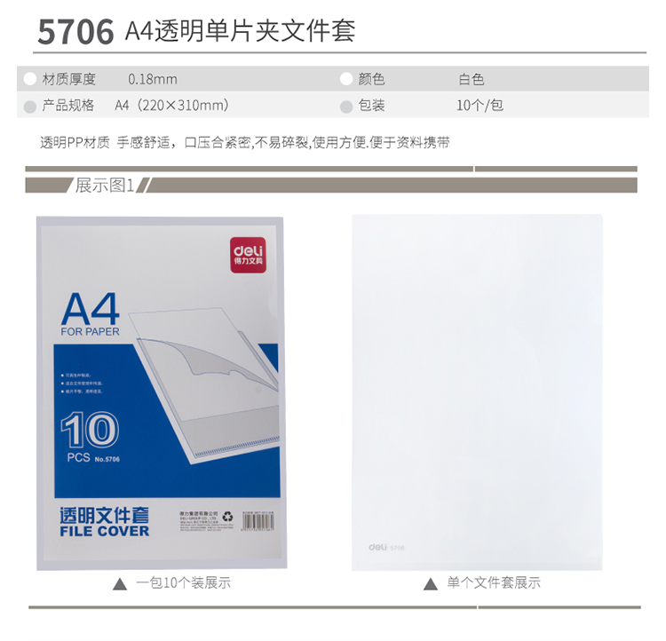 • 商品名称:得力(deli)5706 A4透明两页文件套 单片夹文件袋 10只/包