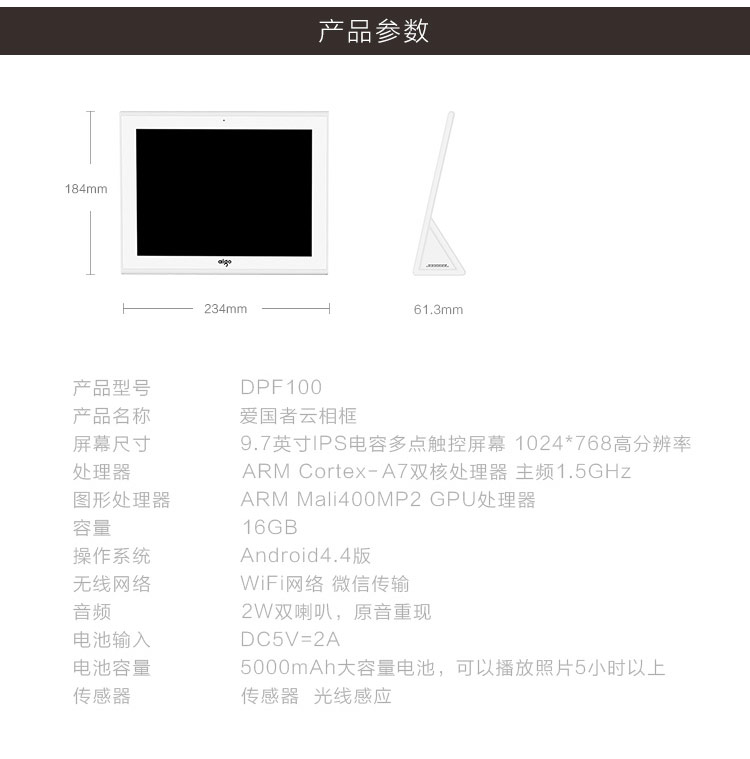 • 商品名称:爱国者(aigo) DPF100 9.7英寸电子相册 数码相框 多点触摸屏 16GB内存
