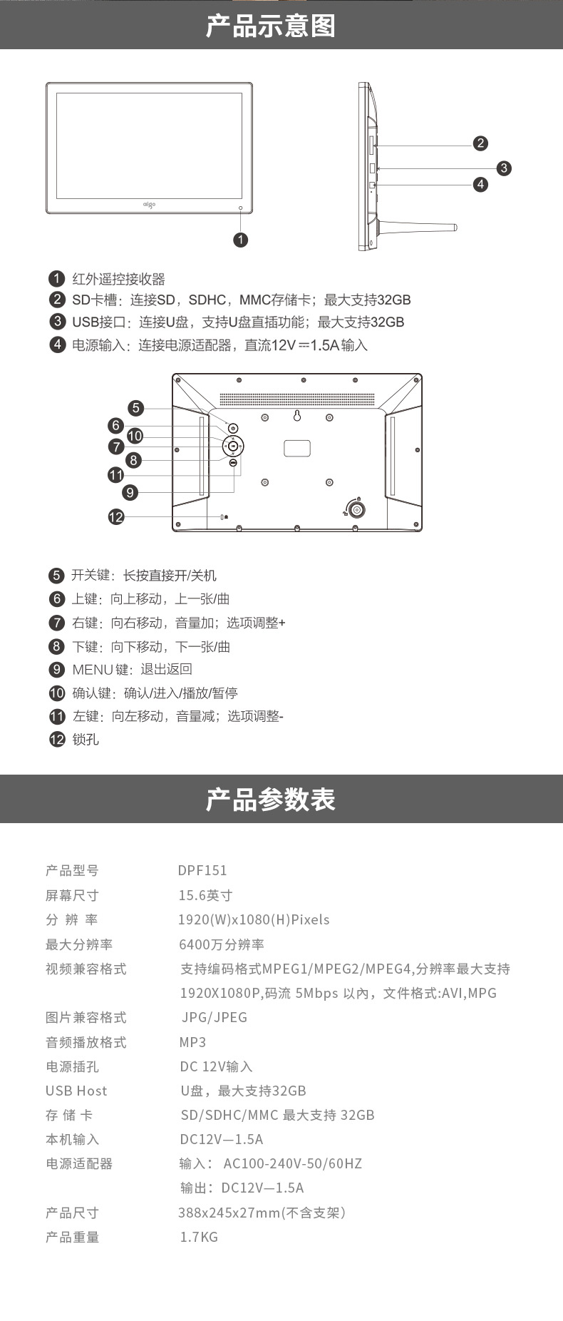 • 商品名称:爱国者(aigo) DPF151 15.6英寸数码相框 高清电子相册 可遥控 支持音乐视频 白色