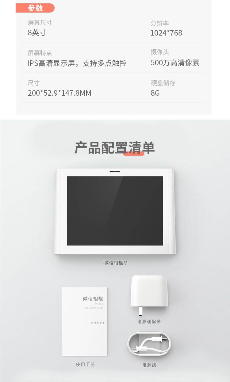 • 商品名称:微信相框 W-M3 腾讯官方出品电子相册 支持视频通话 8英寸高清IPS触摸屏 智能数码相框