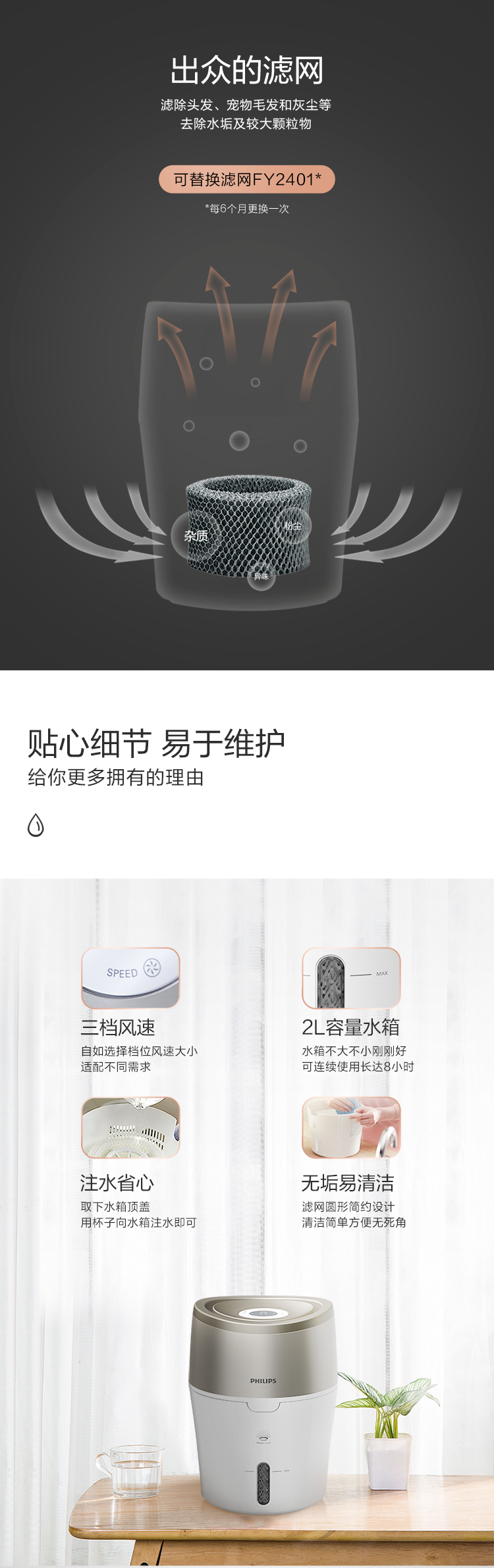 飞利浦(PHILIPS) HU4803 加湿器 上加水 自动湿度设置 湿度数显 无雾恒湿 静音空气加湿