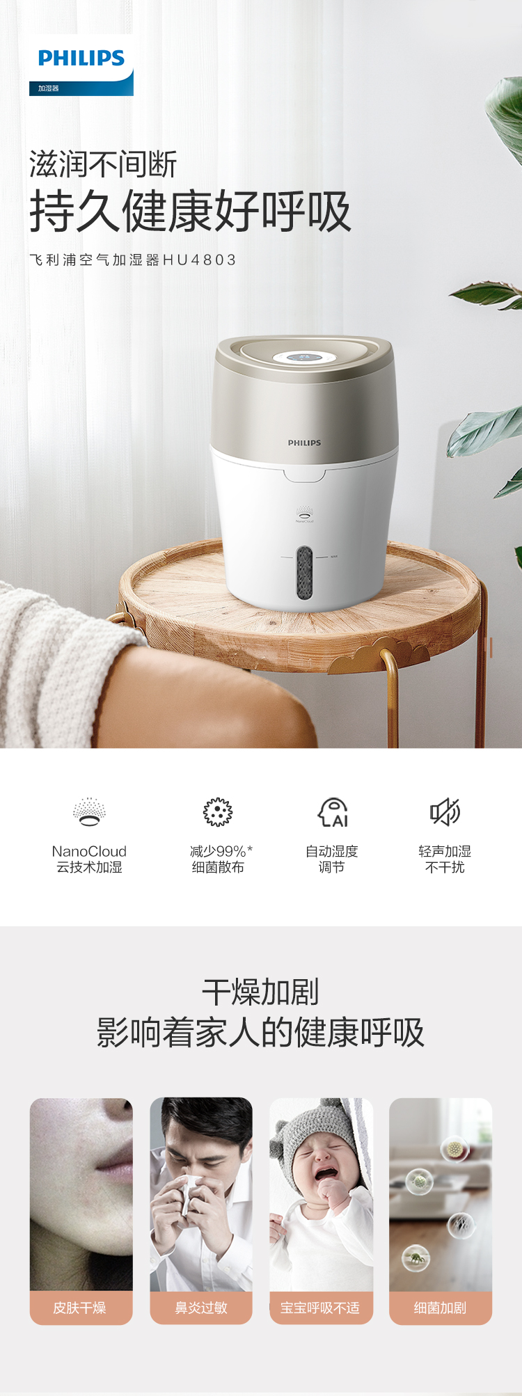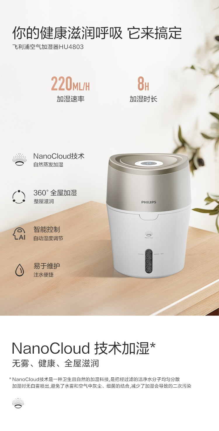 • 商品名称:飞利浦(PHILIPS) HU4803 加湿器 上加水 自动湿度设置 湿度数显 无雾恒湿 静音空气加湿
