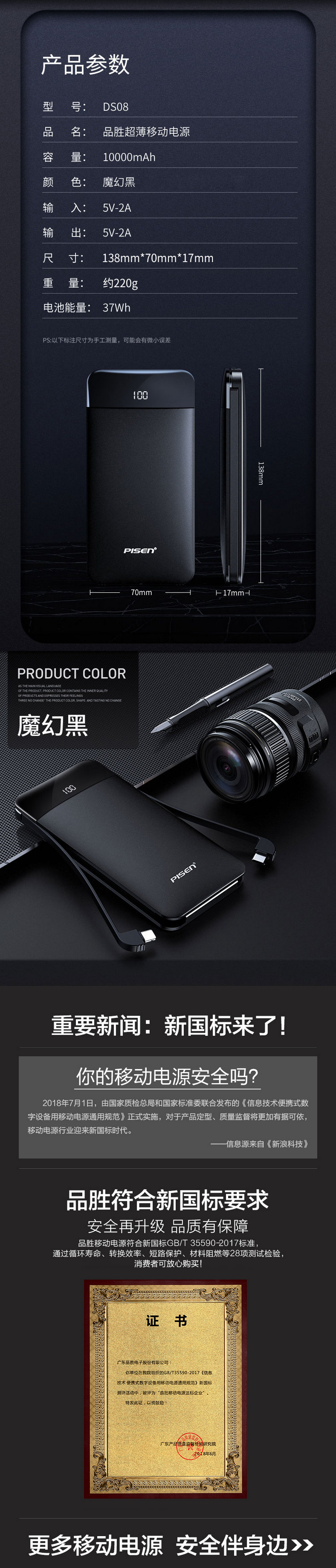 • 商品名称:品胜(PISEN) DS08 10000毫安移动电源/充电宝自带线苹果 Type-c接口 聚合物超薄小巧便携
