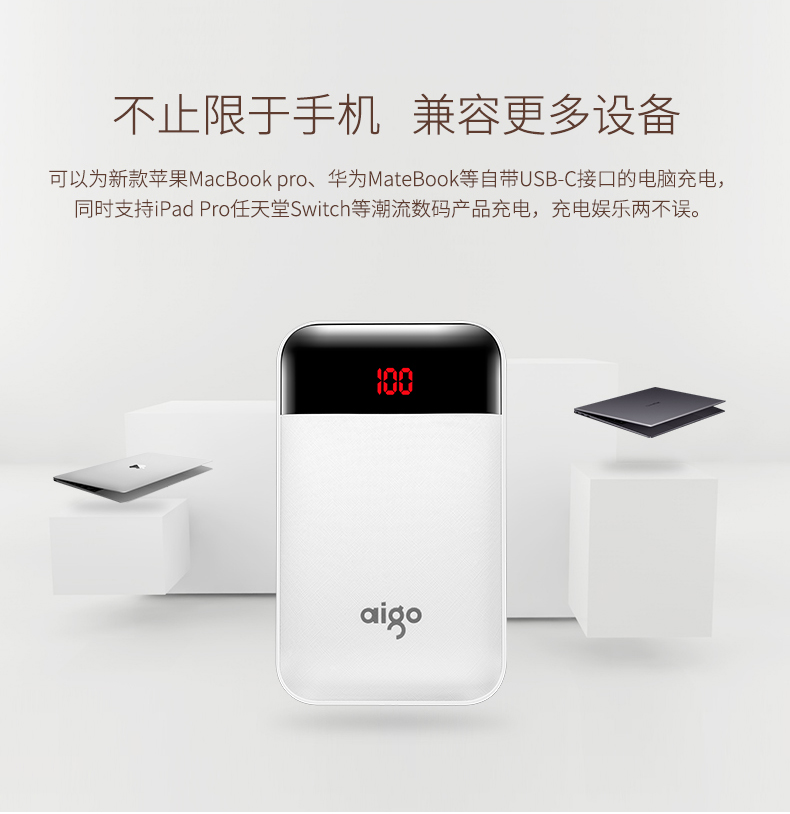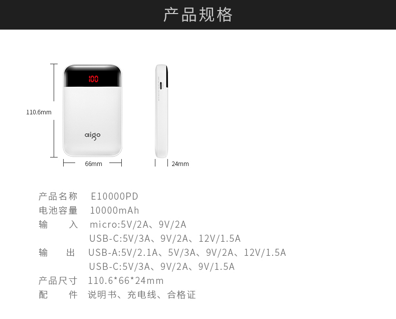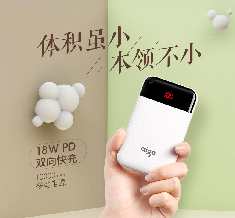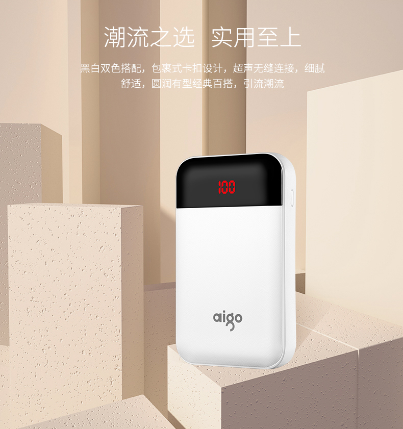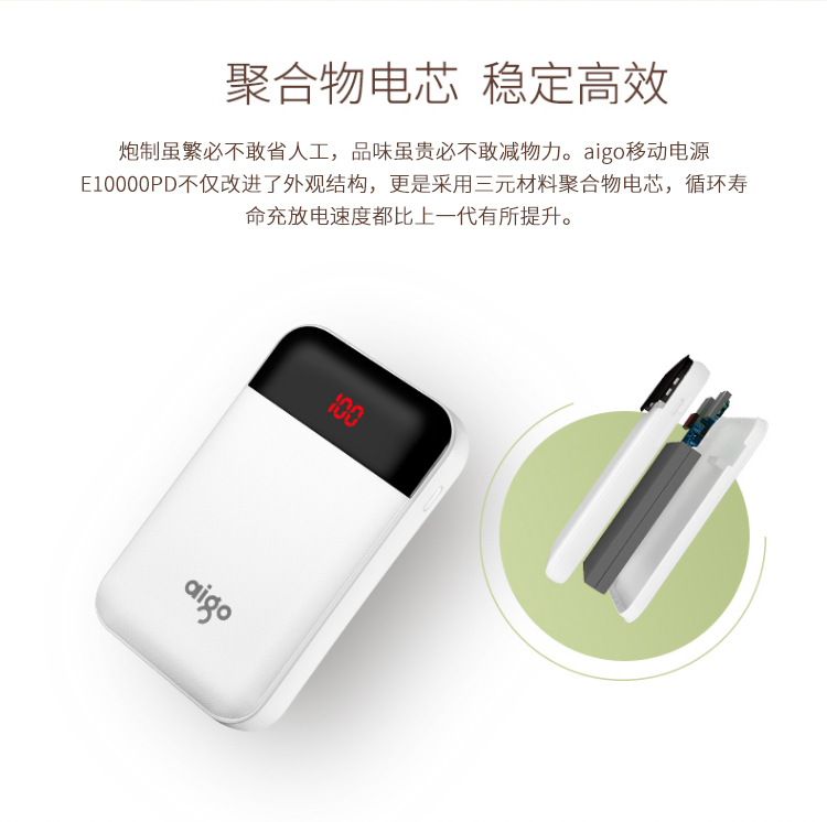 • 商品名称:爱国者(aigo) E10000PD 聚合物 TYPE-C 18W双向快充 10000毫安充电宝 快充移动电源 白色