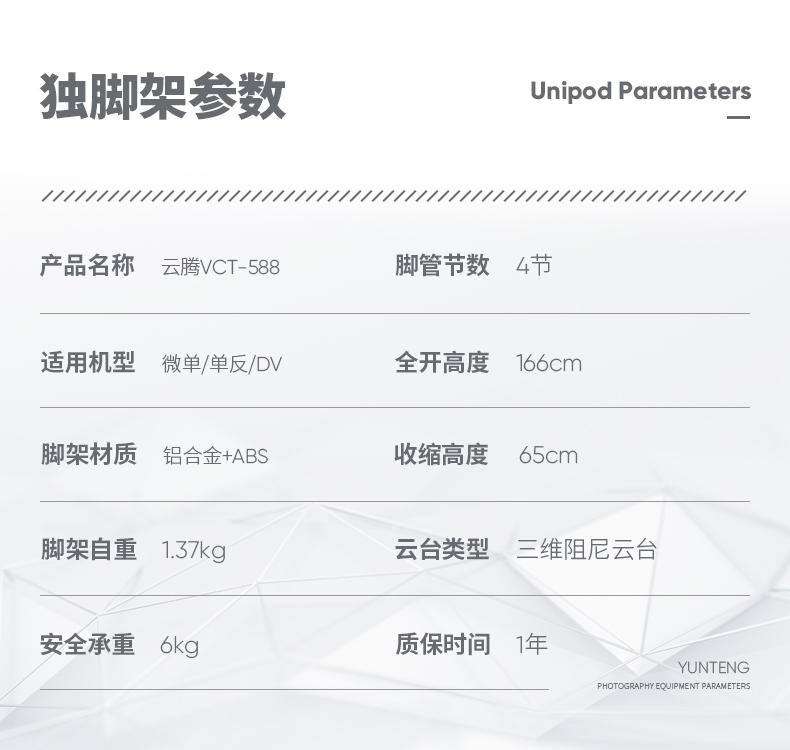 • 商品名称:云腾(YUNTENG) 588 专业独脚架单反摄像机液压阻尼铝合金稳定独角支架赛事跟拍通 带三脚撑单脚架