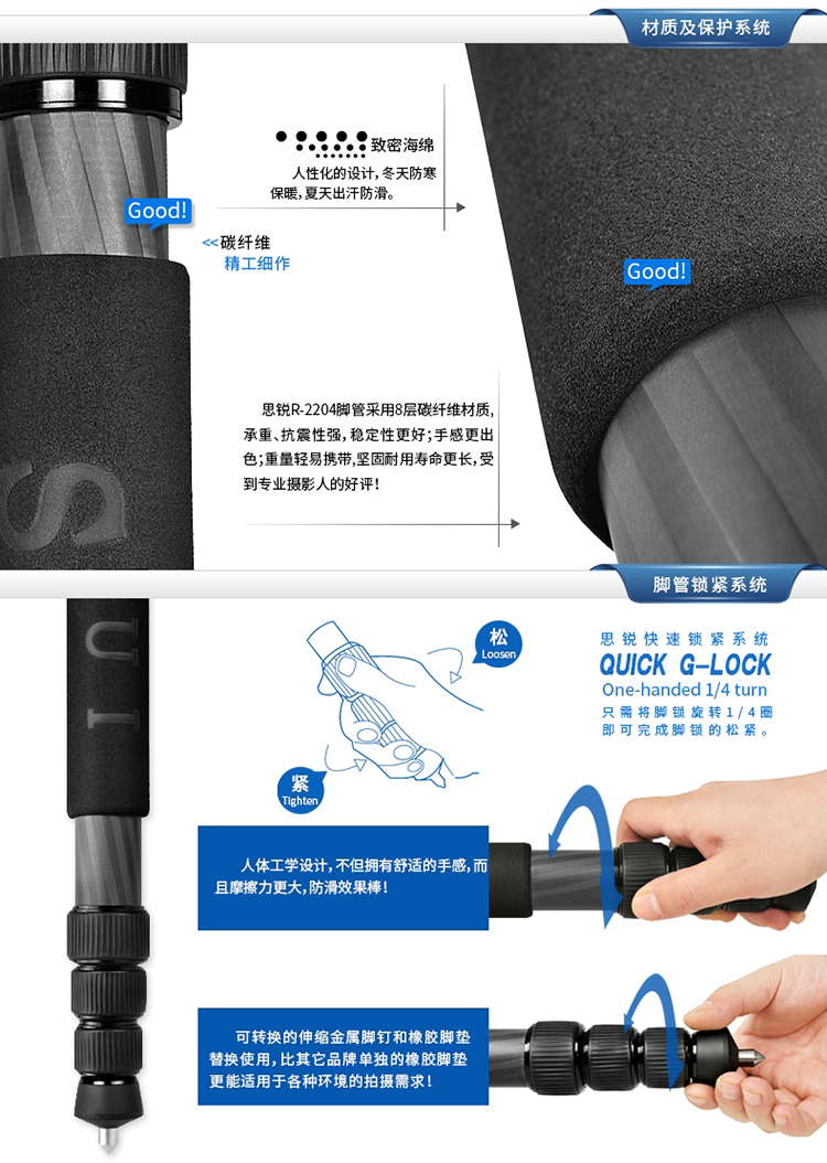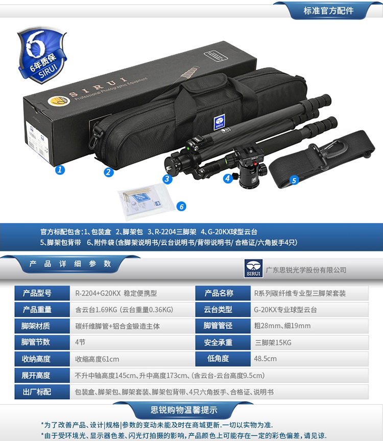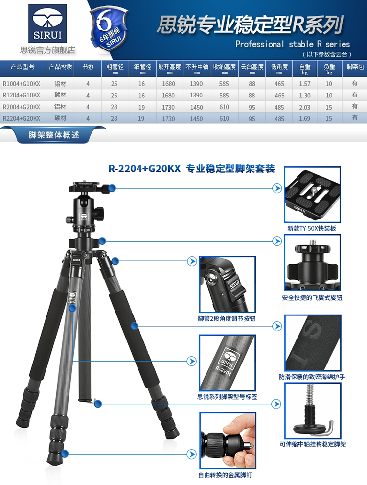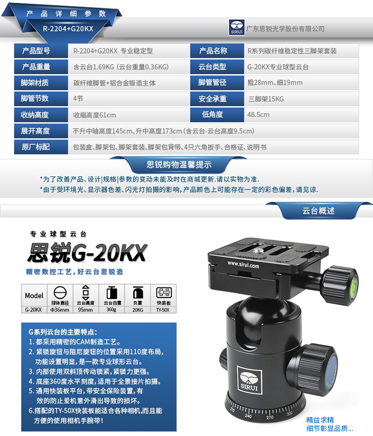 • 商品名称:思锐(SIRUI) R2204+G20KX 碳纤维含云台尼康佳能单反相机三角架 单反相机三脚架 专业稳定 微单通用